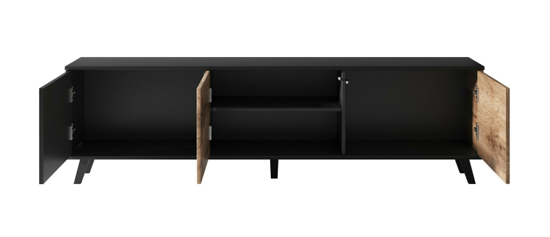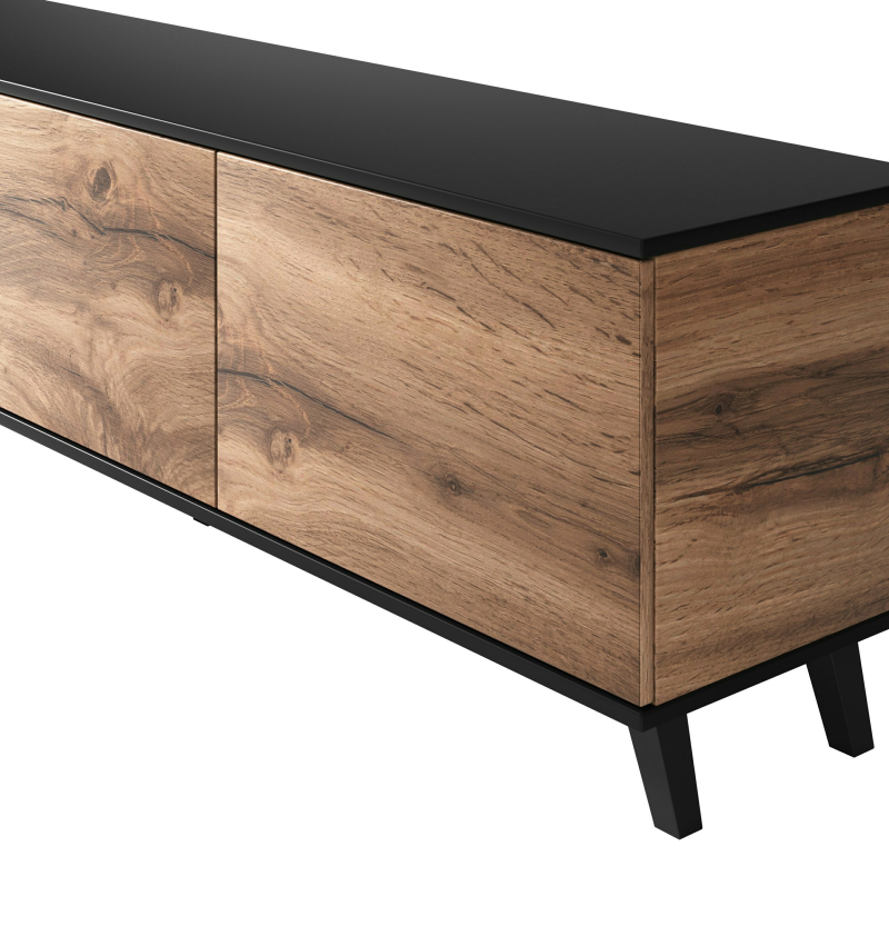 Szafka RTV RANDOM RTV-2 – Nowoczesna Elegancja i Funkcjonalność w Twoim Salonie! Przedstawiamy szafkę RTV RANDOM RTV-2, która łączy w sobie stylowy design inspirowany stylem industrialnym i loftowym z nowoczesną funkcjonalnością. Jej charakterystyczne połączenie kolorystyczne dębu wotan i czerni tworzy wyrazisty mebel, który z pewnością stanie się centralnym punktem Twojej strefy rozrywki. Wyjątkowe Połączenie Kolorów i Detali: Szafka RTV RANDOM RTV-2 wyróżnia się nowoczesnym zestawieniem ciepłego odcienia dębu wotan z eleganckimi czarnymi nóżkami. Posiada troje drzwi, z czego jedne są czarne i posiadają ryflowaną strukturę, charakterystyczną dla kolekcji RANDOM. Pozostałe dwoje drzwi są w kolorze dębu wotan, tworząc interesujący kontrast. Funkcjonalność, Przestrzeń i Komfort Użytkowania: Dzięki wymiarom 180 cm szerokości, 40 cm głębokości i 52 cm wysokości, szafka RTV oferuje wystarczającą przestrzeń na Twój telewizor oraz sprzęt audio-wideo. Trzy zamknięte szafki z systemem otwierania na dotyk ("push to open") pomogą ukryć kable i inne akcesoria, utrzymując porządek w Twoim salonie i podkreślając minimalistyczny design. Wnętrze szafek zapewnia praktyczne miejsce do przechowywania. Wysoka Jakość Materiałów: Szafka RTV została wykonana z wysokiej jakości materiałów: płyty meblowej okleinowanej (dąb wotan) oraz MDF okleinowanego (czarne drzwi, w tym ryflowane), co gwarantuje jej trwałość i estetyczny wygląd na lata. Solidne nóżki z polipropylenu w kolorze czarnym zapewniają stabilność i dodają nowoczesnego akcentu. Stwórz Kompletną Aranżację z Kolekcją RANDOM: Z przyjemnością informujemy, że w naszej ofercie dostępna jest pełna kolekcja mebli RANDOM. Odkryj różnorodność stylowych i funkcjonalnych brył w spójnej palecie kolorystycznej dębu wotan i czerni. Dzięki temu z łatwością zaaranżujesz spójne i eleganckie wnętrze w całym swoim domu! Specyfikacja Produktu:
