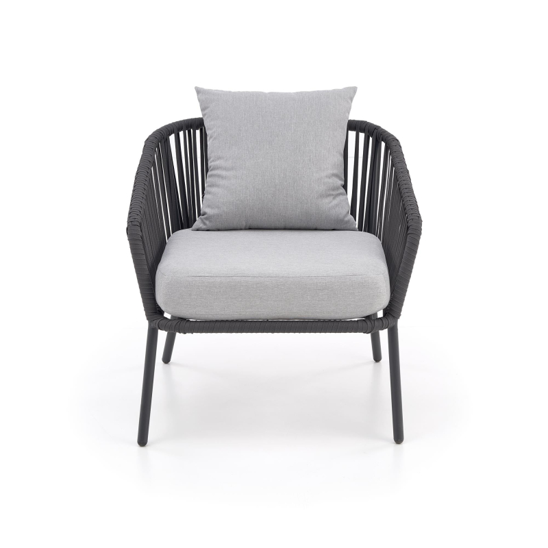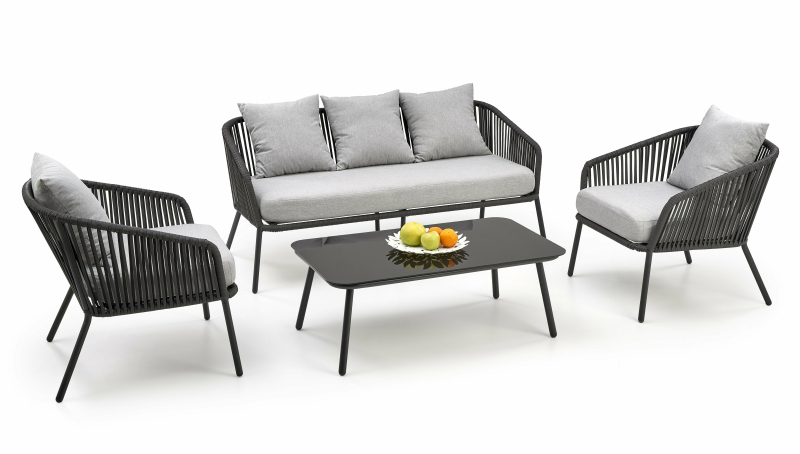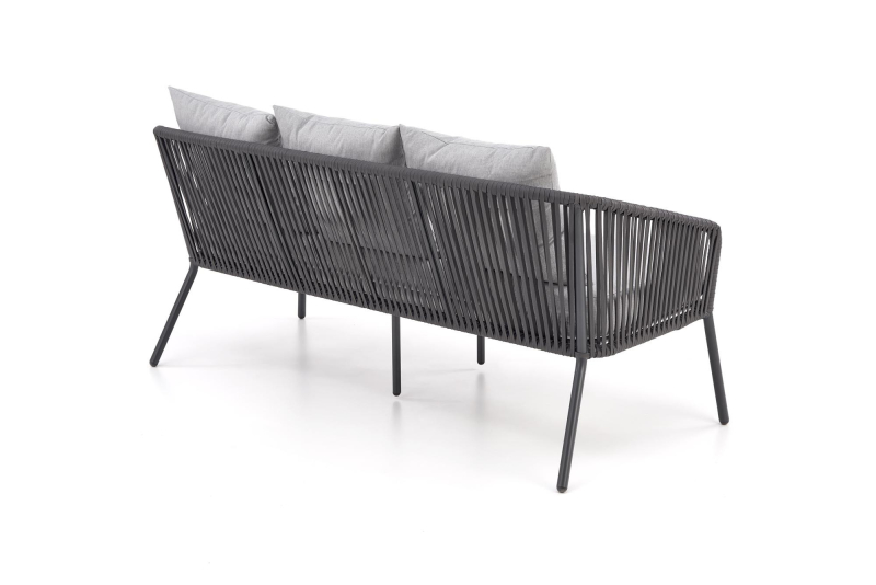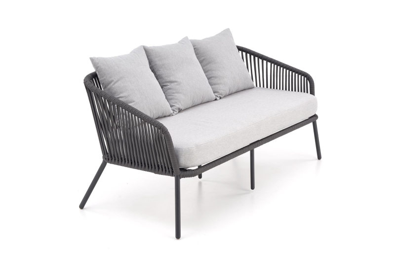 zestaw ogrodowy ( sofa + fotel 2x + ława ), wymiary: 155/71/70/43 cm (sofa), 71/71/70/43 cm (fotel), 99/59/37 cm (ława), materiał: aluminium malowane proszkowo / szkło / linka / tkanina, kolor: ciemny popiel - jasny popiel