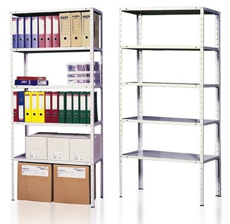 OPIS: | Regał magazynowy. Komplet regału tworzą cztery słupy nośne perforowane co 55 mm, wykonane z blachy czarnej o grubości 2 mm oraz 5 półek profilowanych z blachy o grubości 0.8 mm. Całość skręcana śrubami o średnicy 6 mm oraz malowana farbami proszkowymi (epoksydowo-poliestrowymi) w kolorze RAL 7035. Na życzenie (za dopładą) wykonujemy listwy zabezpieczające boczne i tylne. Maksymalny udźwig półki 70 kg. |