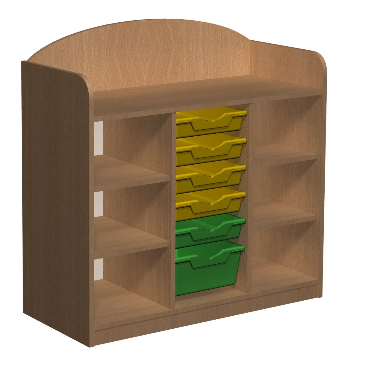 Dane techniczne | Szafka z nadstawką posiadająca 3 kolumny. W skrajnych są po 3 otwarte półki, a w środkowej części znajdują się pojemniki (5 małych i 1 średni). Cena zawiera pojemniki oraz prowadnice, które posiadają zabezpieczenie przed całkowitym wysunięciem pojemników. Wymiary szafki: 1050x1041x450 mm (wys. x szer. x gł.). Kolorystyka płyty meblowej: Kolorystyka płyty meblowej do wyboru. |