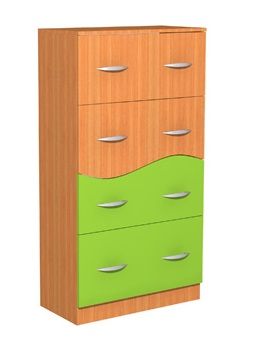 | Regał z szufladami Fala 32. Wymiar (WxSxG) 1500x800x400 mm. Wykonana z płyty laminowanej 18mm. Fronty szuflad w kształcie fali, dwa fronty wykonane są z płyty kolorowej - kolor do wyboru. Regał posiada 4 pojemne szuflady. Metalowe uchwyty. | |
