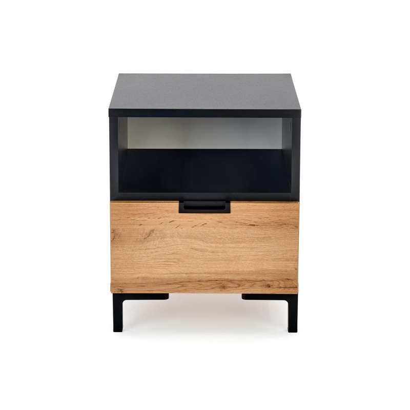 Szafka Nocna SILVIA – Nowoczesny Design z Akcentem Dębu Wotan i CzerniSzafka nocna SILVIA to mebel, który wyróżnia się odważnym, geometrycznym designem i modnym połączeniem ciepłego dębu wotan z głęboką czernią, idealnie pasującym do nowoczesnych, loftowych oraz awangardowych sypialni. Jej oryginalna konstrukcja sprawia, że jest nie tylko funkcjonalnym, ale i dekoracyjnym elementem wnętrza. Główne cechy produktu: