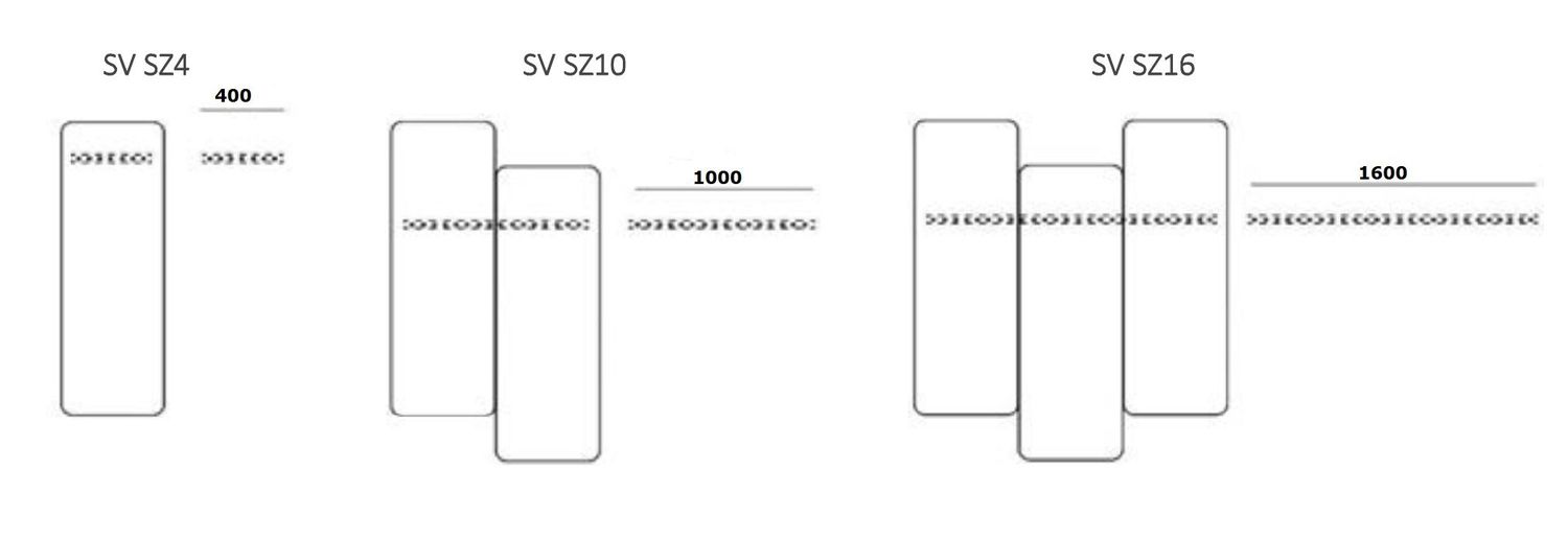 Szyny montażowe: | Dobór szyn montowanych do ściany w zależności od ilości montowanych paneli. W konfiguratorze modelu, do wyboru poniższe szyny. SV SZ4 - szyna montażowa 400 mm, montowana do ściany, do zawieszenia pojedynczego panela. SV SZ10 - szyna montażowa 1000 mm, montowana do ściany, do zawieszenia 2 paneli bezpośrednio obok siebie. SV SZ16 - szyna montażowa 1600 mm, montowana do ściany, do zawieszenia 3 paneli bezpośrednio obok siebie. |