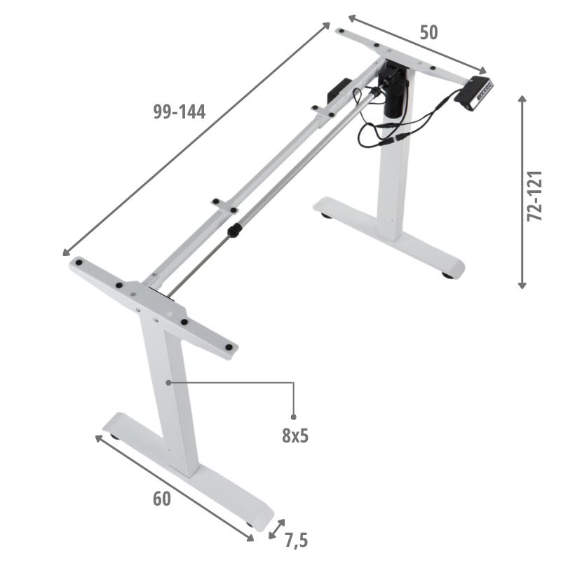 Stelaż metalowy do stołu/biurka NY-131A/60 z regulacją długości belki 100-160x szer.60 x wys. 72,5 kolor biały Stelaż metalowy z regulowana belką na długości. regulacja długości w zakresie 100-160 cm - co 10 cm stelaż skręcany, malowany proszkowo przekrój belki: 40x30 mm przekrój nóg: 60x30 mm wysokość 72,5 cm grubości ścianek: nogi - 1,35 mm, belki - 1,2 mm nogi zakończone tworzywową stopką poziomującąStelaż do samodzielnego montażuGwarancja 24 miesięcyWymiary :
