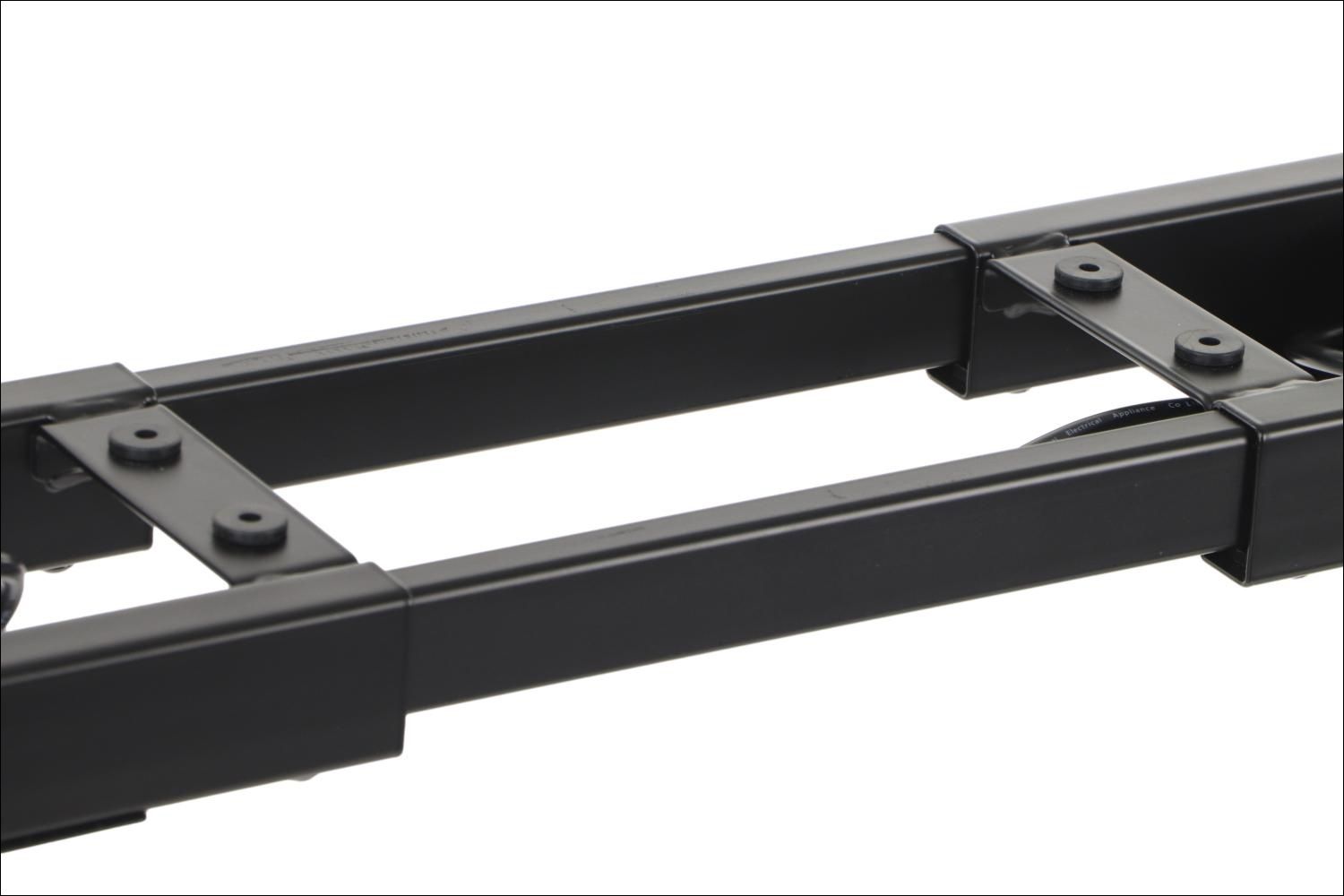 Stelaż ramowy do stolika NY-L04 czarny, L=80-130 cm, wysokość h=42 cm Dane techniczne stelaża: regulacja długości w zakresie 80-130 cm - co 10 cm stelaż skręcany, malowany proszkowo kolor czarny przekrój belki: 40x30 mm przekrój nóg: 40x20 mm wysokość 42 cm grubości ścianek: nogi - 1,2 mm, belki - 1,2 mm nogi zakończone regulowaną stopką tworzywową Wymiary: 80-130 x 50 x 42 cm