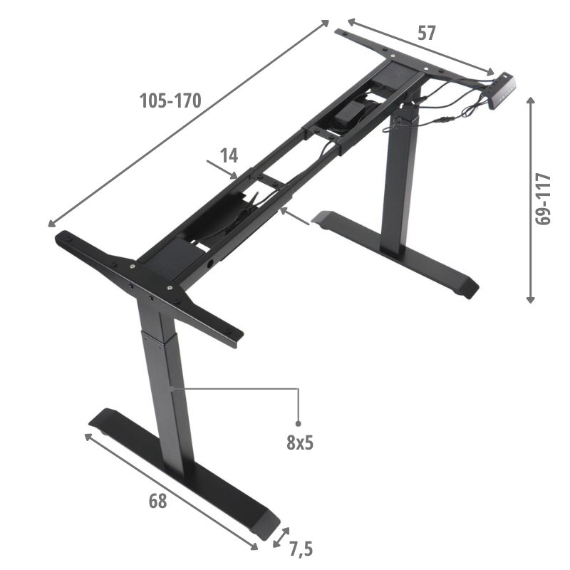 Stelaż PRATO 04-2T/W z elektryczną regulacją wysokości w zakresie 69-117 cm kolor biały/ 2-silnikowyStelaże elektryczne to idealne rozwiązanie dla osób, które chcą zadbać o swoje zdrowie i dobre samopoczucie. Dzięki niemu można regulować wysokość biurka, co pozwala na zmianę pozycji ciała i uniknięcie bólu pleców, szyi i ramion.W dzisiejszych czasach, kiedy większość ludzi spędza wiele godzin przed komputerem, ważne jest, aby zadbać o swoje zdrowie i dobre samopoczucie. Oprócz ergonomicznego krzesła obrotowego, warto zwrócić uwagę na ergonomiczne biurko, które pozwoli na łatwą zmianę pozycji ciała podczas pracy i uniknięcie bólu pleców. Taką możliwość daje nam stelaż wyposażony w automatyczną regulację wysokości oraz inne funkcje takie jak: system antykolizyjny, czy też możliwość zaprogramowania kilku pozycji wysokości. Dane techniczne stelaża:elektryczna regulacja wysokości w zakresie 69-117 cmręczna regulacja długości w zakresie 105-170 cmnoga 2-segmentowaprędkość podnoszenia 30 mm/smaksymalne obciążenie stelaża 100 kg przy równomiernym obciążeniu blatupamięć 3 pozycji wysokościsystem antykolizyjny - po napotkaniu przeszkody napęd automatycznie się wyłączyfunkcja blokady przyciskówzasilanie 100-240 Vzasilanie silnika 24Vstopki poziomującemalowany proszkowo w kolorze białymWymiary: Uwaga:Produkt do samodzielnego montażu.Gwarancja 24 miesiąceWyposażenie opcjonalne (do kupienia osobno) - poziomy kanał kablowy, zawieszka na komputer, metalowa szuflada podblatowa - dostępne na naszym sklepie.