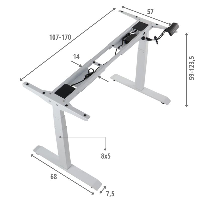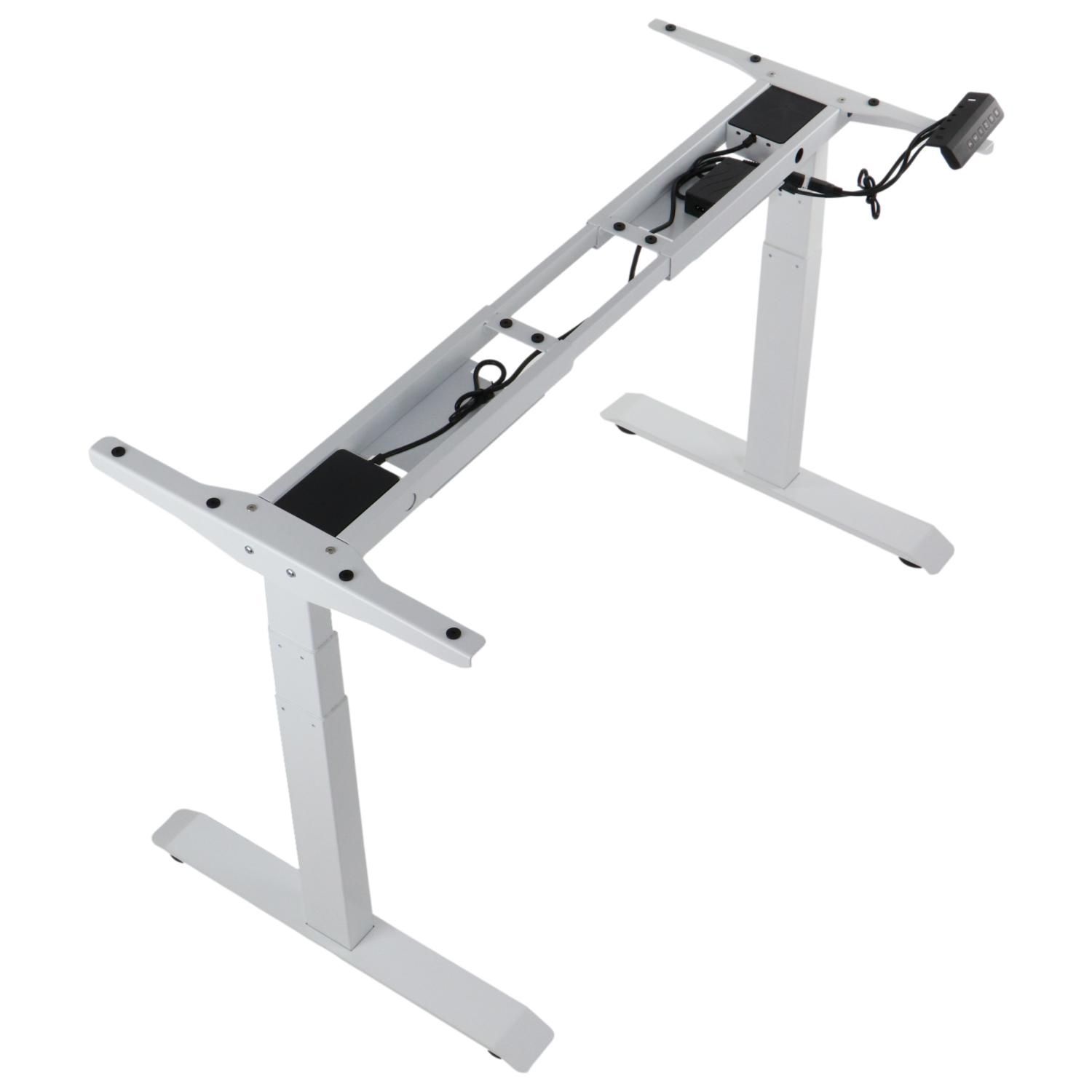 Stelaż PRATO 04-2T/W z elektryczną regulacją wysokości w zakresie 69-117 cm kolor biały/ 2-silnikowyStelaże elektryczne to idealne rozwiązanie dla osób, które chcą zadbać o swoje zdrowie i dobre samopoczucie. Dzięki niemu można regulować wysokość biurka, co pozwala na zmianę pozycji ciała i uniknięcie bólu pleców, szyi i ramion.W dzisiejszych czasach, kiedy większość ludzi spędza wiele godzin przed komputerem, ważne jest, aby zadbać o swoje zdrowie i dobre samopoczucie. Oprócz ergonomicznego krzesła obrotowego, warto zwrócić uwagę na ergonomiczne biurko, które pozwoli na łatwą zmianę pozycji ciała podczas pracy i uniknięcie bólu pleców. Taką możliwość daje nam stelaż wyposażony w automatyczną regulację wysokości oraz inne funkcje takie jak: system antykolizyjny, czy też możliwość zaprogramowania kilku pozycji wysokości. Dane techniczne stelaża:elektryczna regulacja wysokości w zakresie 69-117 cmręczna regulacja długości w zakresie 105-170 cmnoga 2-segmentowaprędkość podnoszenia 30 mm/smaksymalne obciążenie stelaża 100 kg przy równomiernym obciążeniu blatupamięć 3 pozycji wysokościsystem antykolizyjny - po napotkaniu przeszkody napęd automatycznie się wyłączyfunkcja blokady przyciskówzasilanie 100-240 Vzasilanie silnika 24Vstopki poziomującemalowany proszkowo w kolorze białymWymiary: Uwaga:Produkt do samodzielnego montażu.Gwarancja 24 miesiąceWyposażenie opcjonalne (do kupienia osobno) - poziomy kanał kablowy, zawieszka na komputer, metalowa szuflada podblatowa - dostępne na naszym sklepie.
