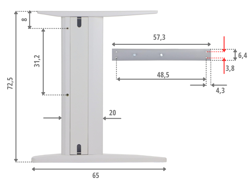 Podstawa do stolika SH-3050-2/W wysokość 72 cm, 44,5x44,5 cm - kolor biały PODSTAWOWE CECHY element dolny o wymiarach 44,5x44,5 cm element dolny wykonany z blachy o gr. 7 mm, malowanej proszkowo noga o średnicy 75 mm wykonana ze stali malowanej proszkowo, grubość ścianki 1,2 mm element górny wykonany z blachy tłoczonej 29x29 cm o gr. 3 mm element górny wyposażony w 8 otworów montażowych o średnicy 5 mm regulowane stopki podstawa skręcana, dostarczana w elementach do samodzielnego montażu gwarancja 24 miesiące Wymiary:
