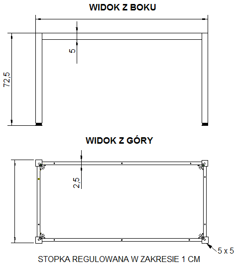Stelaż do stołu i biurka A057/KC 66x66 cm, nogi kwadratowe 5x5 cm - CZARNY Dane techniczne: przystosowane do blatów płytowych dostępne w różnych wymiarach rama + 4 nogi o przekroju 5x5 cm grubości ścianek: nogi - 1,8 mm, belki - 1,3 mm stelaż skręcany, malowany proszkowo nogi wyposażone są w regulowane stopki w zakresie 1 cm KOLORYSTYKA STELAŻA - czarny (RAL 9005): w zestawie śruby do montażu blatu o grubości od 25 mm; Wymiary Długość: 66 cm Szerokość: 66 cm Wysokość: 72,5 cm Kolor Malowany proszkowo w kolorze czarnym. Gwarancja Stelaż do biurka lub stołu konferencyjnego, cena nie obejmuje blatu. Stelaż do samodzielnego montażu. Gwarancja 24-miesięczna. System od "drzwi do drzwi" dla Państwa pełnego komfortu. System "door to door" - z ang - od drzwi do drzwi Termin "door to door" wg WIKIPEDII: " sposób realizacji naprawy urządzenia, który polega na przesłaniu pocztą kurierską uszkodzonego sprzętu do serwisu (na koszt serwisu). Naprawione urządzenie wraca następnie przesyłką kurierską do właściciela także na koszt serwisu"