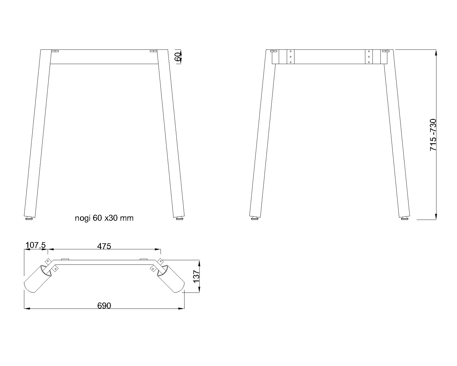 OPIS: | Stelaż do biurka/stołu: charakteryzujący się skośnymi nogami z profilu o przekroju eliptycznym 60x30 mm, wyposażonymi w stopki z metalu chromowanego i zakończone stopkami z tworzywa służącymi do poziomowania biurka/stołu, połączone łamaną poprzeczką o przekroju 60x20 mm, . Konstrukcja stelaża umożliwia ustawienie nóg w narożnikach blatu. Stelaż jest łączony belkami o długości regulowanej. |