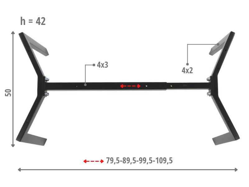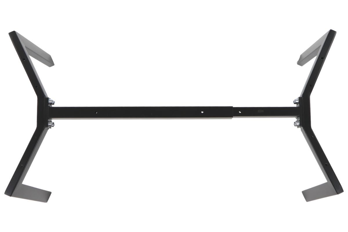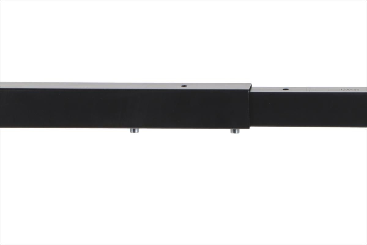 Stelaż ramowy do stolika NY-L04 czarny, L=80-130 cm, wysokość h=42 cm Dane techniczne stelaża: regulacja długości w zakresie 80-130 cm - co 10 cm stelaż skręcany, malowany proszkowo kolor czarny przekrój belki: 40x30 mm przekrój nóg: 40x20 mm wysokość 42 cm grubości ścianek: nogi - 1,2 mm, belki - 1,2 mm nogi zakończone regulowaną stopką tworzywową Wymiary: 80-130 x 50 x 42 cm
