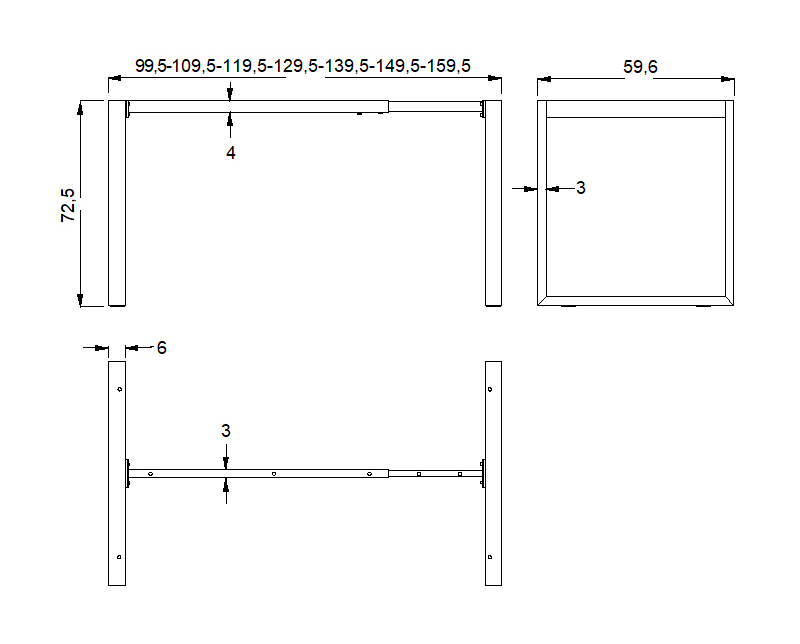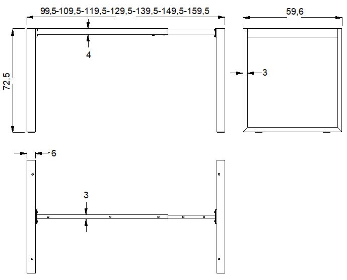 Stelaż metalowy do stołu/biurka NY-131A/60 z regulacją długości belki 100-160x szer.60 x wys. 72,5 kolor biały Stelaż metalowy z regulowana belką na długości. regulacja długości w zakresie 100-160 cm - co 10 cm stelaż skręcany, malowany proszkowo przekrój belki: 40x30 mm przekrój nóg: 60x30 mm wysokość 72,5 cm grubości ścianek: nogi - 1,35 mm, belki - 1,2 mm nogi zakończone tworzywową stopką poziomującąStelaż do samodzielnego montażuGwarancja 24 miesięcyWymiary :
