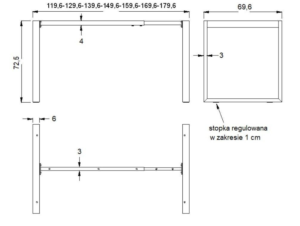 Stelaż metalowy do stołu/biurka NY-131A/60 z regulacją długości belki 100-160x szer.60 x wys. 72,5 kolor biały Stelaż metalowy z regulowana belką na długości. regulacja długości w zakresie 100-160 cm - co 10 cm stelaż skręcany, malowany proszkowo przekrój belki: 40x30 mm przekrój nóg: 60x30 mm wysokość 72,5 cm grubości ścianek: nogi - 1,35 mm, belki - 1,2 mm nogi zakończone tworzywową stopką poziomującąStelaż do samodzielnego montażuGwarancja 24 miesięcyWymiary :