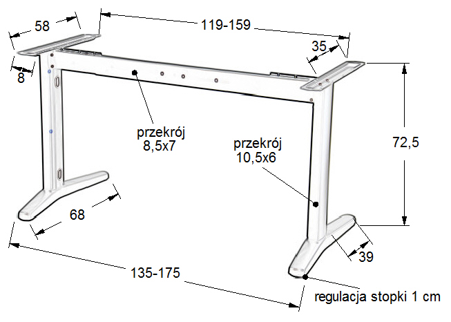 Stelaż metalowy do stołu/biurka NY-131A/60 z regulacją długości belki 100-160x szer.60 x wys. 72,5 kolor biały Stelaż metalowy z regulowana belką na długości. regulacja długości w zakresie 100-160 cm - co 10 cm stelaż skręcany, malowany proszkowo przekrój belki: 40x30 mm przekrój nóg: 60x30 mm wysokość 72,5 cm grubości ścianek: nogi - 1,35 mm, belki - 1,2 mm nogi zakończone tworzywową stopką poziomującąStelaż do samodzielnego montażuGwarancja 24 miesięcyWymiary :