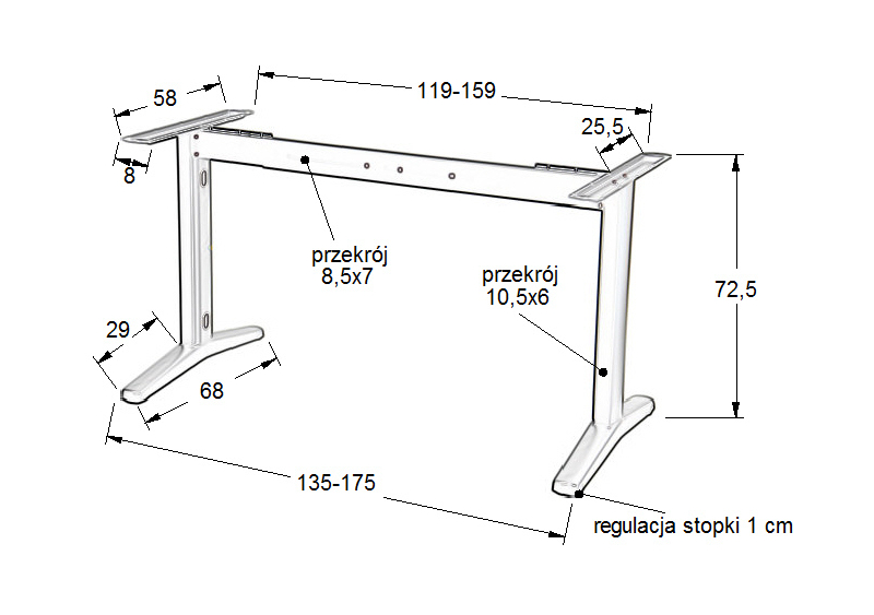 Stelaż metalowy do stołu/biurka NY-131A/60 z regulacją długości belki 100-160x szer.60 x wys. 72,5 kolor biały Stelaż metalowy z regulowana belką na długości. regulacja długości w zakresie 100-160 cm - co 10 cm stelaż skręcany, malowany proszkowo przekrój belki: 40x30 mm przekrój nóg: 60x30 mm wysokość 72,5 cm grubości ścianek: nogi - 1,35 mm, belki - 1,2 mm nogi zakończone tworzywową stopką poziomującąStelaż do samodzielnego montażuGwarancja 24 miesięcyWymiary :
