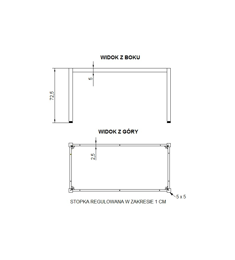 Stelaż do stołu i biurka A057/KC 66x66 cm, nogi kwadratowe 5x5 cm - CZARNY Dane techniczne: przystosowane do blatów płytowych dostępne w różnych wymiarach rama + 4 nogi o przekroju 5x5 cm grubości ścianek: nogi - 1,8 mm, belki - 1,3 mm stelaż skręcany, malowany proszkowo nogi wyposażone są w regulowane stopki w zakresie 1 cm KOLORYSTYKA STELAŻA - czarny (RAL 9005): w zestawie śruby do montażu blatu o grubości od 25 mm; Wymiary Długość: 66 cm Szerokość: 66 cm Wysokość: 72,5 cm Kolor Malowany proszkowo w kolorze czarnym. Gwarancja Stelaż do biurka lub stołu konferencyjnego, cena nie obejmuje blatu. Stelaż do samodzielnego montażu. Gwarancja 24-miesięczna. System od "drzwi do drzwi" dla Państwa pełnego komfortu. System "door to door" - z ang - od drzwi do drzwi Termin "door to door" wg WIKIPEDII: " sposób realizacji naprawy urządzenia, który polega na przesłaniu pocztą kurierską uszkodzonego sprzętu do serwisu (na koszt serwisu). Naprawione urządzenie wraca następnie przesyłką kurierską do właściciela także na koszt serwisu"