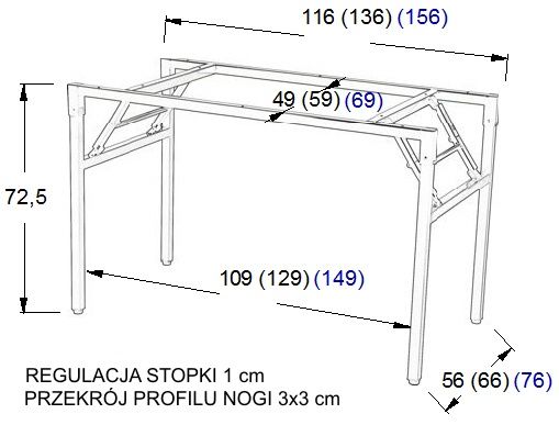 Stelaż do stołu i biurka 57/OC 156x66 cm, nogi okrągłe fi 5 cm - CZARNY Dane techniczne: przystosowany do blatów płytowych dostępny w różnych wymiarach i kolorach rama + 4 nogi o średnicy 5 cm grubości ścianek: nogi - 1,8 mm, belki - 1,3 mm stelaż skręcany, malowany proszkowo nogi wyposażone są w regulowane stopki w zakresie 1 cm KOLORYSTYKA STELAŻA - czarnym: w zestawie śruby do montażu blatu o grubości od 25 mm; Wymiary Długość: 156 cm Szerokość: 66 cm Wysokość: 72,5 cm Stelaże można zastosować do blatów o wymiarach: od 80x80 cm do 200x80 cm. Kolor Malowany proszkowo w kolorze czarnym. Uwagi Stelaż do biurka lub stołu konferencyjnego, cena nie obejmuje blatu. Stelaż do samodzielnego montażu. Gwarancja 24-miesięczna. System od "drzwi do drzwi" dla Państwa pełnego komfortu. System "door to door" - z ang - od drzwi do drzwi Termin "door to door" wg WIKIPEDII: " sposób realizacji naprawy urządzenia, który polega na przesłaniu pocztą kurierską uszkodzonego sprzętu do serwisu (na koszt serwisu). Naprawione urządzenie wraca następnie przesyłką kurierską do właściciela także na koszt serwisu"