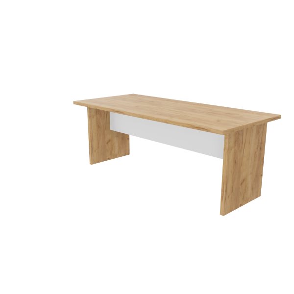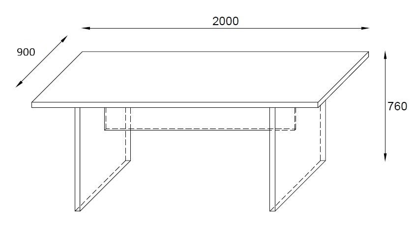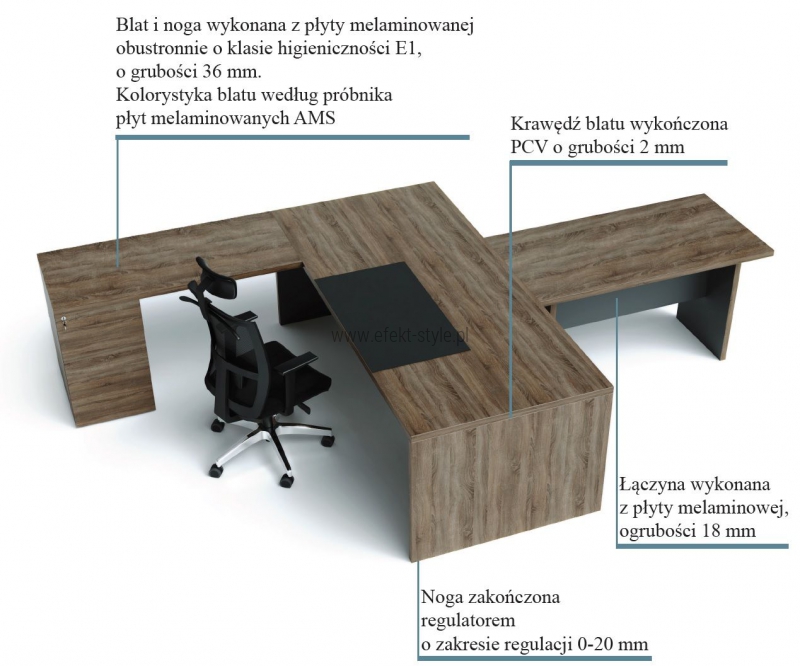 OPIS TECHNICZNY: | Stół konferencyjny na podstawie płytowej, blat i nogi wykonane są z płyty melaminowanej obustronnie o klasie higieniczności E1, o grubości 36 mm. Krawędź blatu wykończona PCV o grubości 2 mm. |