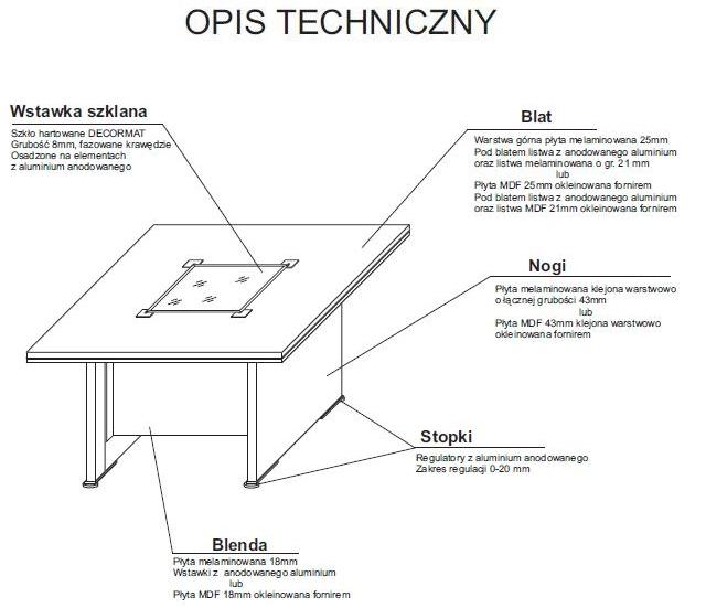 BLAT: | Warstwa górna blatu - płyta melaminowana o grubości 25mm; Pod blatem listwa z anodowanego aluminium oraz listwa z płyty melaminowanej o gr. 21mm; Na życzenie przepusty z anodowanego aluminium - bez dopłat; | |