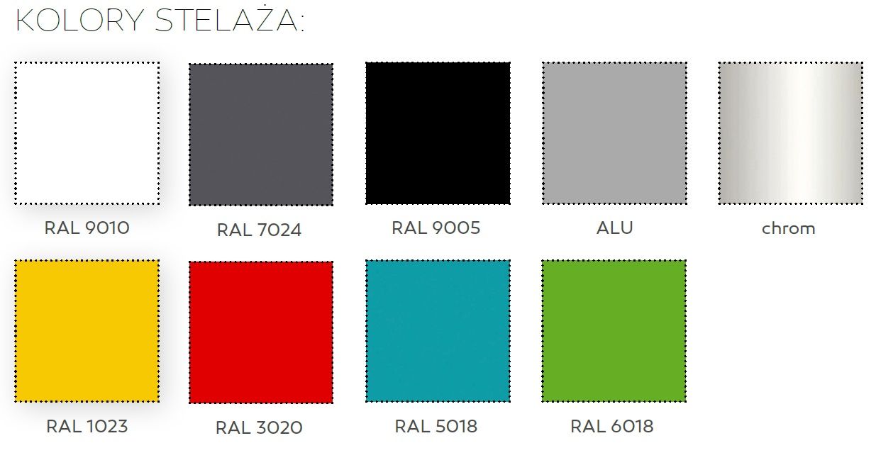 | Kolor - stelaż/podstawa: | czarny, biały, chrom, inne kolory, aluminium/popielaty |