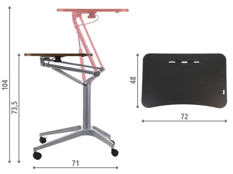 Stolik mobilny z regulacja wysokości SH-A10 szary/orzech Dane techniczne stolika: Szczegóły wykonania - zdjęcia regulowana wysokość w zakresie 73,5-104 cm podstawa wyposażona w 4 kółka, w tym 2 przednie z hamulcem blat z płyty laminowanej o wymiarach 72x48 cm z miejscem na przybory do pisania regulowane stopki stolik skręcany, dostarczany w elementach wyrób przeznaczony do użytkowania wewnątrz suchych pomieszczeń Kolorystyka : stelaż kolor szary, blat - kolor orzech Wymiary: Towar do samodzielnego montażu - instrukcja dołączona do przesyłki. Gwarancja 24 miesiące