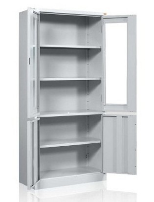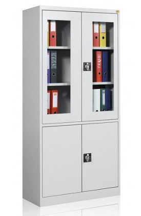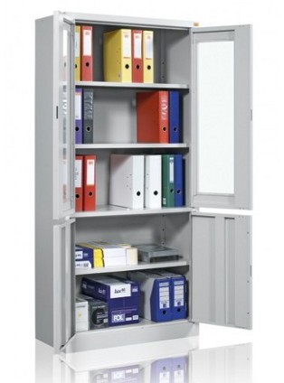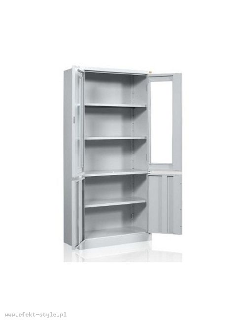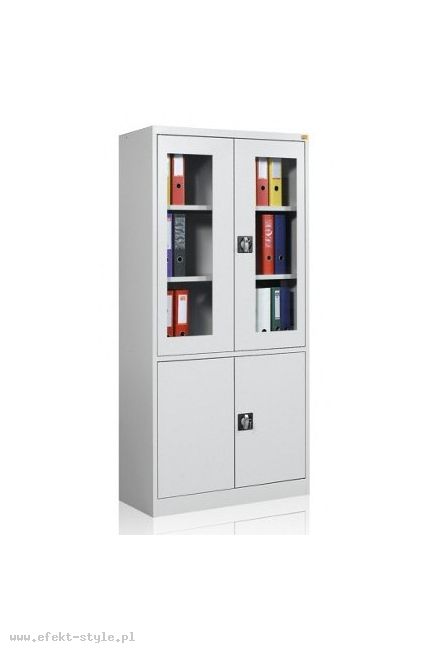 OPIS: | Szafa witrynowa biurowa, dwudzielna. Część górna posiada dwa przeszklone szkłem hartowanym skrzydła drzwi uchylnych, zawieszonych na zawiasach kołkowych oraz dwie metalowe półki. Część dolna wyposażona jest w jedną metalową półkę zamykaną pełnymi drzwiami uchylnymi. | |