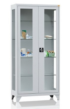OPIS: | Szafa medyczna posiada dwa skrzydła drzwi uchylnych, zawieszone na zawiasach kołkowych. Szafa wykonana jest z blachy czarnej o grubości 0,8 - 1 mm, malowana farbami proszkowymi (epoksydowo-poliestrowymi). Drzwi i boki szafy posiadają przeszklenie wykonane z szyby hartowanej, zamykane są zamkiem baskwilowym, ryglującym w trzech punktach i wykończonych uchwytem klamkowym. Szafa wyposażona jest w 4 półki wykonane ze szkła hartowanego o maksymalnym udźwigu 25 kg. | |