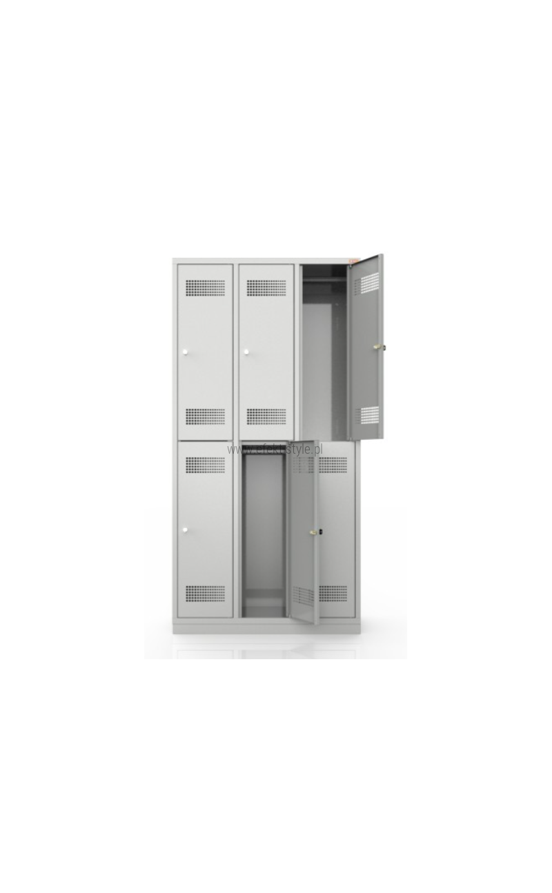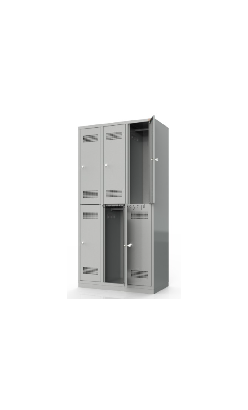 OPIS: | Sześciodrzwiowa szafa skrytkowa. Każda z komór wyposażona jest w wieszaki boczne oraz drążek na wieszaki ubraniowe. W drzwiach skrytek wykonane są otwory wentylacyjne. Wykonana z blachy czarnej o grubości 0.6 mm 1 mm, malowana farbami proszkowymi (epoksydowo-poliestrowymi). Skrytki zamykane zamkami krzywkowym. Całość osadzona na cokole wykonanym z blachy ocynkowanej (malowanej) o grubości 1 mm. |