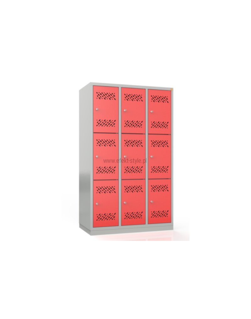 OPIS: | Skrytki rozmieszczone są w trzech kolumnach po trzy rzędy. W każdej ze skrytek umieszczona jest półka na przybory szkolny. W drzwiach skrytek wykonane są otwory wentylacyjne. Szafa wykonana jest z blachy czarnej o grubości 0,6 - 1,5 mm, malowana farbami proszkowymi (epoksydowo-poliestrowymi). Drzwi zamykane są zamkiem krzywkowym w systemie MASTER KEY. Całość osadzona na cokole wykonanym z blachy ocynkowanej (malowanej) o grubości 1,0 mm.