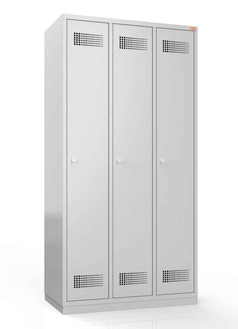 OPIS: | Trzydrzwiowa szafa ubraniowa wyposażona jest w półkę, wieszaki boczne oraz drążek na wieszaki ubraniowe. Wykonana jest z blachy czarnej o grubości 0.6 mm - 1 mm, malowana farbami proszkowymi (epoksydowo-poliestrowymi). Zamykana zamkiem krzywkowym w systemie MASTER KEY. Całość osadzona na cokole wykonanym z blachy ocynkowanej (malowanej) o grubości 1 mm. |