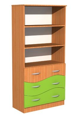 Regał z szufladami Fala 32 Regał z szufladami Fala 32. Wymiar (WxSxG) 1500x800x400 mm. Wykonana z płyty laminowanej 18mm. Fronty szuflad w kształcie fali, dwa fronty wykonane są z płyty kolorowej - kolor do wyboru. Regał posiada 4 pojemne szuflady. Metalowe uchwyty. Kolorystyka Kolorystyka do wyboru według konfiguracji modelu Kolor płyty meblowej do wyboru. Wyboru dokonujemy w konfiguracji modelu, która znajduje się powyżej. Atesty Szafka posiada certyfikat dopuszczający do użytkowania w jednostkach oświatowych (certyfikat COBRABID). Gwarancja 24 miesiące Terminy Towar na zamówienie. Produkcja około 3-6 tygodni.