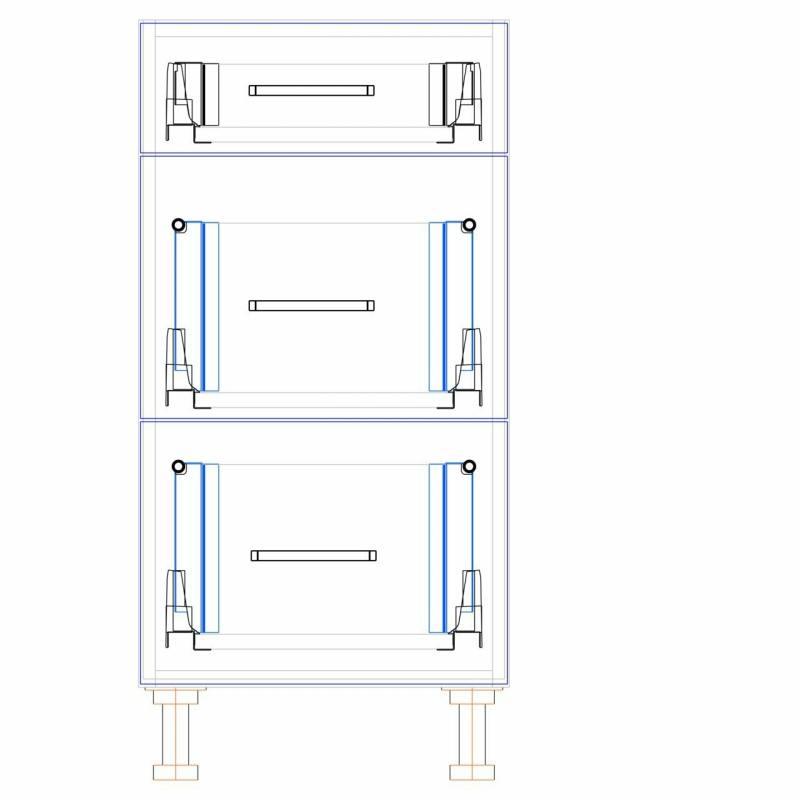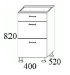 OPIS TECHNICZNY: | Szafka posiada trzy szuflady umieszczone jedna pod drugą. Front, korpus (boki szafki, wieniec dolny) wykonane z płyty 18 mm melaminowanej, widoczne krawędzie oklejone PCV 2 mm. Uchwyt metalowy R1, 2-punktowy w rozstawie 128 mm. Stopki regulacyjne czarne. Zakres regulacji od 85 mm do 120 mm. |