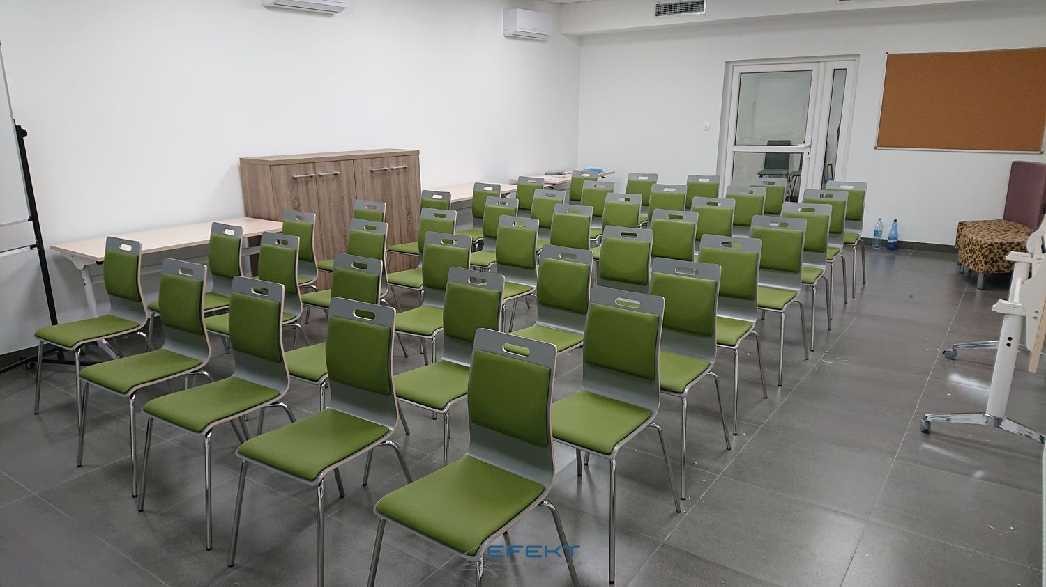 Czyż nie pięknie prezentuje się sala spotkań ? Zaproponowaliśmy krzesła konferencyjne ze sklejki giętej wykończone laminatem HPL w kolorze grafitowym z nakładkami na siedzisku i oparciu w kolorze zielonym. Krzesła te charakteryzują się dużą wytrzymałością. Dedykowane są do intensywnego użytkowania.