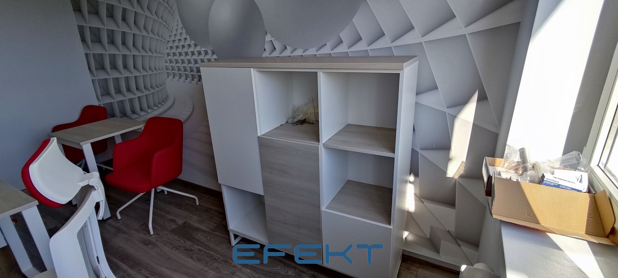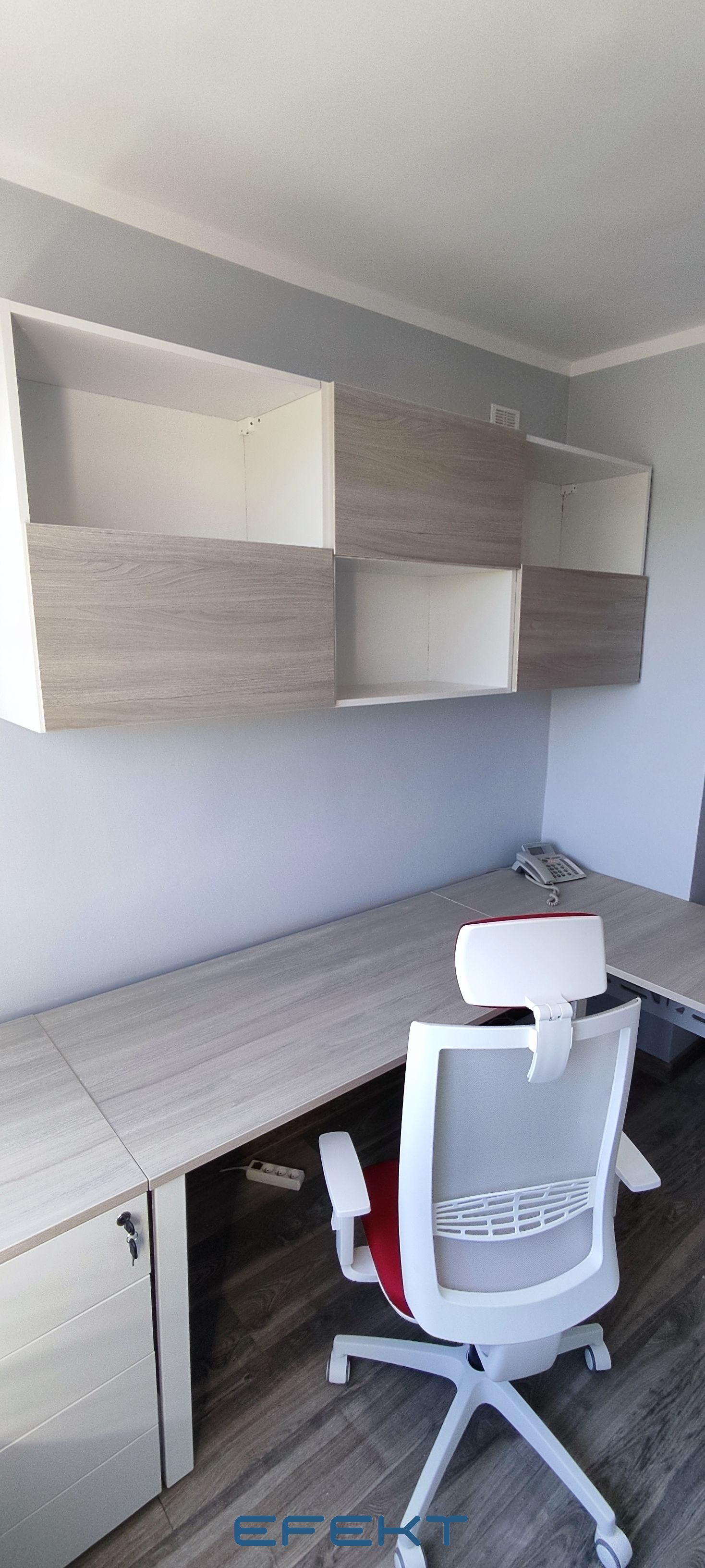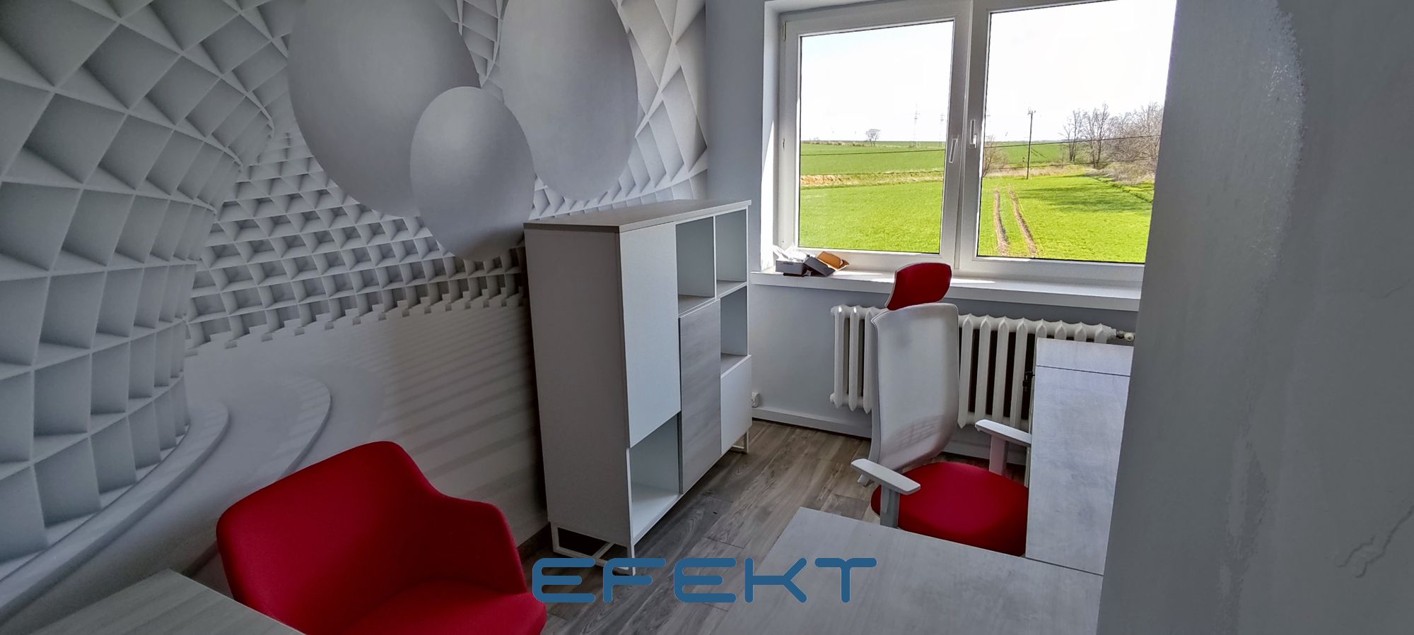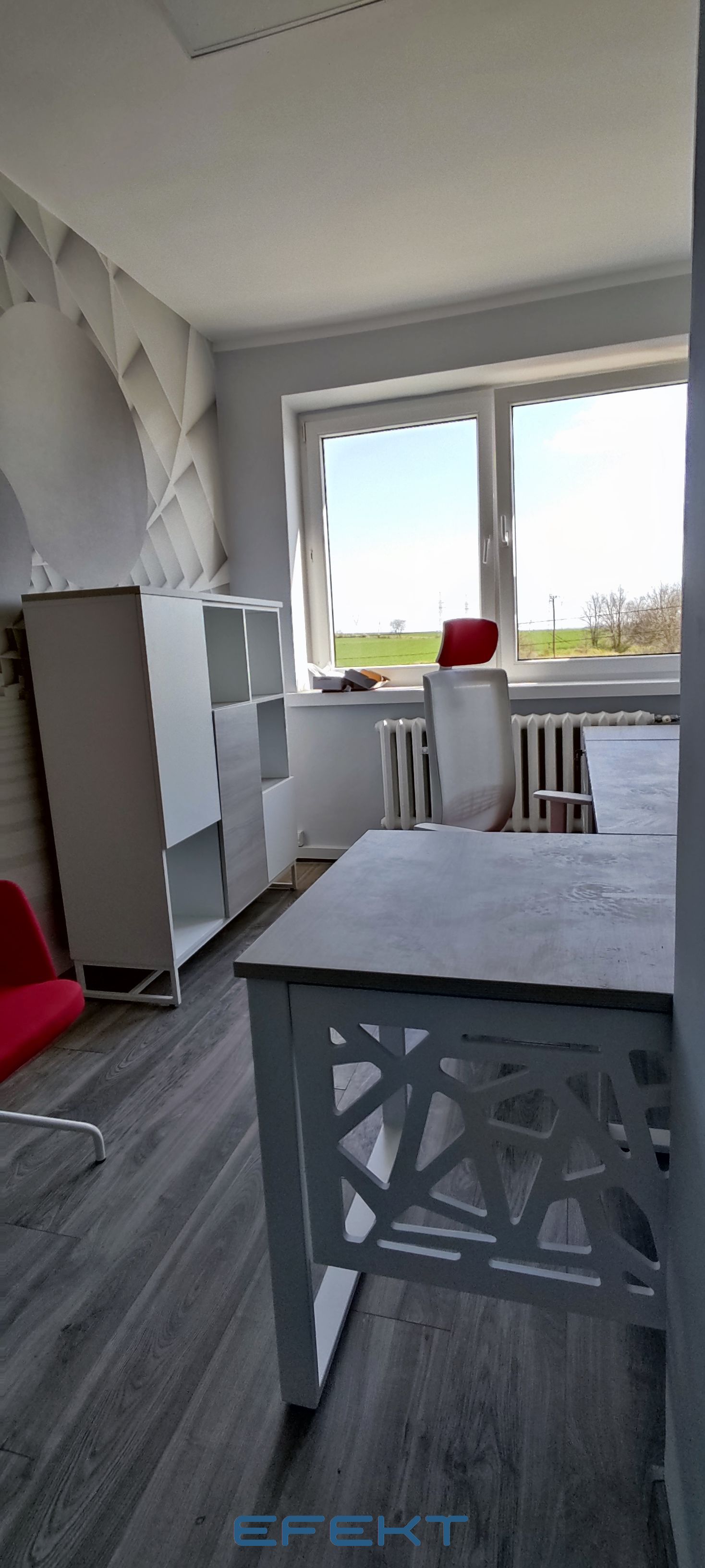 Pomimo, że biuro jest niezbyt duże, ale dzięki dobrze opracowanej koncepcji udało się stworzyć biuro w pełni ergonomiczne i funkcjonalne. Dobrze została zaprojektowana strefa pracy poprzez ulokowanie obszernych biurek. Wiszące szafki zapewniają możliwość przechowywania dokumentów, jednocześnie z łatwym do nich dostępem. Nowoczesna komoda na stelażu metalowym dodaje lekkości temu meblowi. Do rozmów z kontrahentami służą nowoczesne fotele konferencyjne przy niewielkim stoliku. Efekt powiększenia pomieszczenia został uzyskany poprzez perspektywiczną fototapetę. Jasne kolory mebli w połączeniu z czerwienią tapicerki nadają ciekawego charakteru wnętrzu.