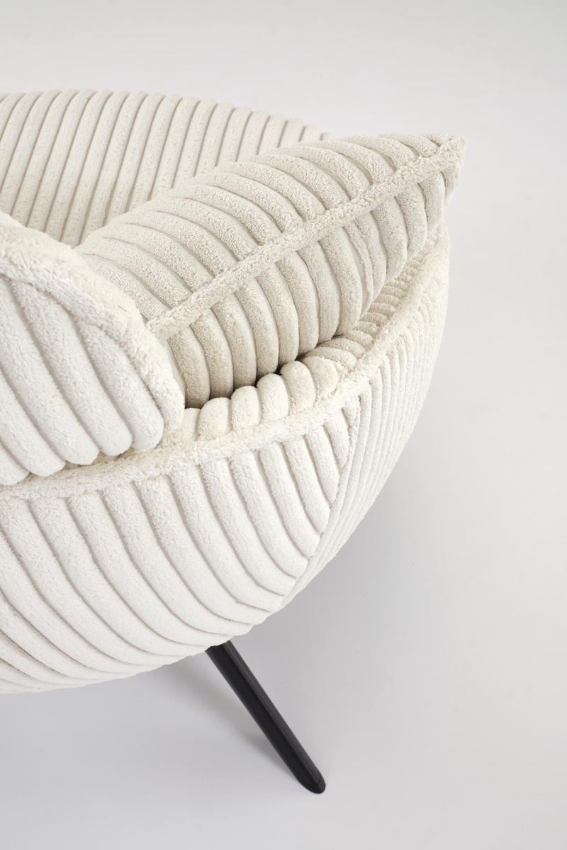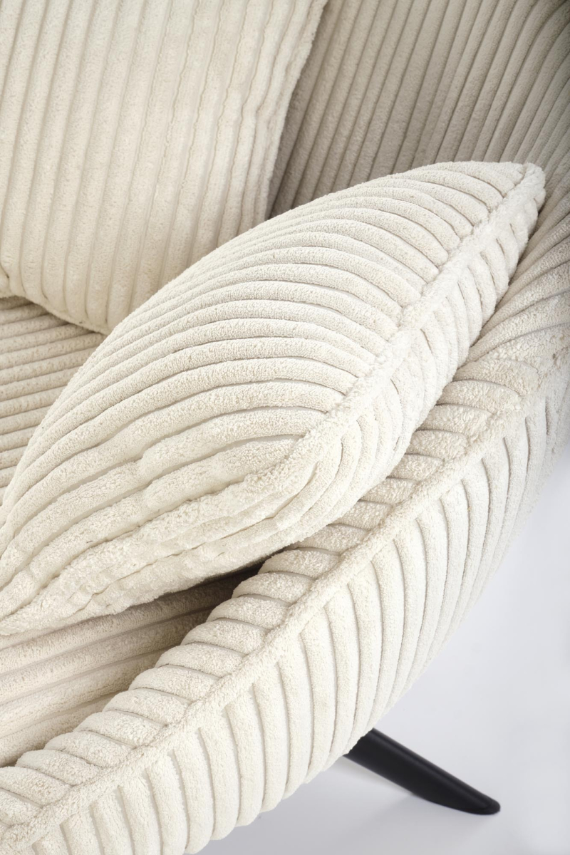 Fotel MERRY 2 wyróżnia się unikalnym, prążkowanym wzorem tapicerki, wykonanej z wysokiej jakości tkaniny w subtelnym, jasnym odcieniu. Ten stylowy detal dodaje fotelowi elegancji i nowoczesnego charakteru. Dodatkowe, miękkie poduszki zwiększają komfort siedzenia i stanowią dodatkowy element dekoracyjny.