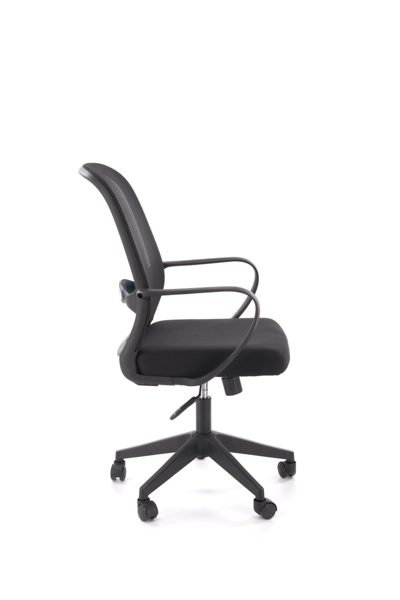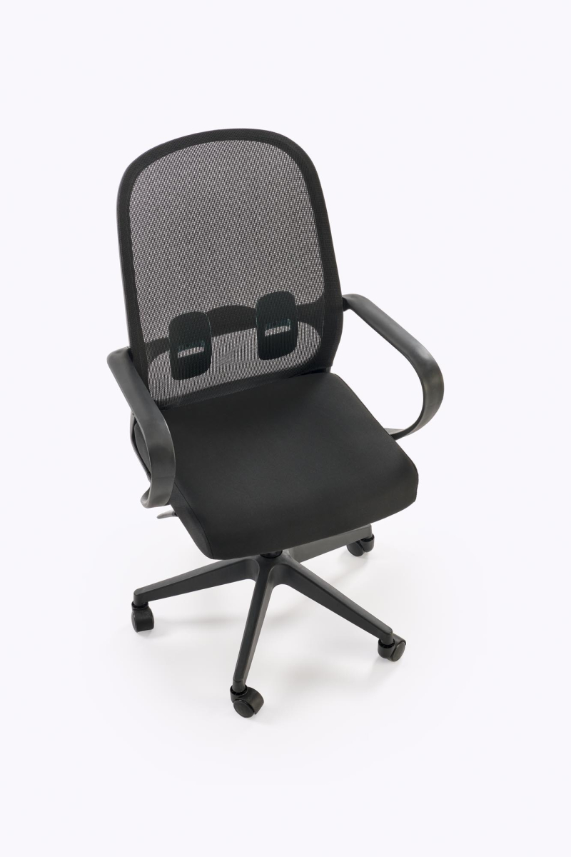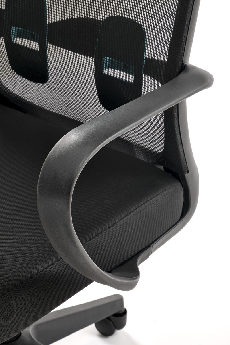 Fotel został wykonany z wysokiej jakości materiałów, łącząc tkaninę z nowoczesną siatką, co zapewnia nie tylko estetyczny wygląd, ale także doskonałą wentylację. Czarna kolorystyka fotela sprawia, że doskonale wpisuje się w różnorodne aranżacje wnętrz, od minimalistycznych po klasyczne. Idealnie nadaje się do pracy w biurze, ale także jako fotel do użytku domowego.