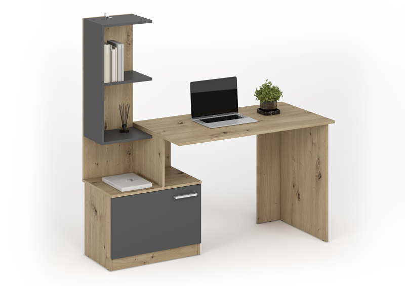 | Przedstawiamy biurko MISO, które łączy w sobie przestronny blat roboczy z funkcjonalnym regałem, tworząc idealne miejsce do pracy i przechowywania. Jego imponujące wymiary wynoszą około 144 cm szerokości, 60 cm głębokości i 142 cm wysokości, oferując znaczną powierzchnię do pracy oraz liczne półki i szafkę na Twoje materiały. Biurko charakteryzuje się nowoczesnym designem, łączącym laminat w jasnym odcieniu z akcentami w dekorze drewna, co nadaje mu stylowy wygląd, pasujący do wielu aranżacji wnętrz. Z jednej strony biurka znajduje się obszerny blat roboczy, idealny na komputer, lampkę i inne niezbędne akcesoria. Z drugiej strony umieszczony jest funkcjonalny regał, oferujący otwarte półki o różnej wielkości, idealne na książki, segregatory czy dekoracje. Dodatkowo, biurko wyposażone jest w pojemną szafkę z uchwytem, umieszczoną w dolnej części regału, co pozwala na dyskretne przechowywanie większych przedmiotów. Wykonane z trwałej płyty meblowej laminowanej, biurko MISO jest łatwe w utrzymaniu czystości i odporne na codzienne użytkowanie. Produkt dostarczany jest w elementach do samodzielnego montażu, a czytelna instrukcja dołączona do przesyłki zapewnia łatwy i sprawny proces składania. Biurko objęte jest 24-miesięczną gwarancją. Parametry biurka MISO: -