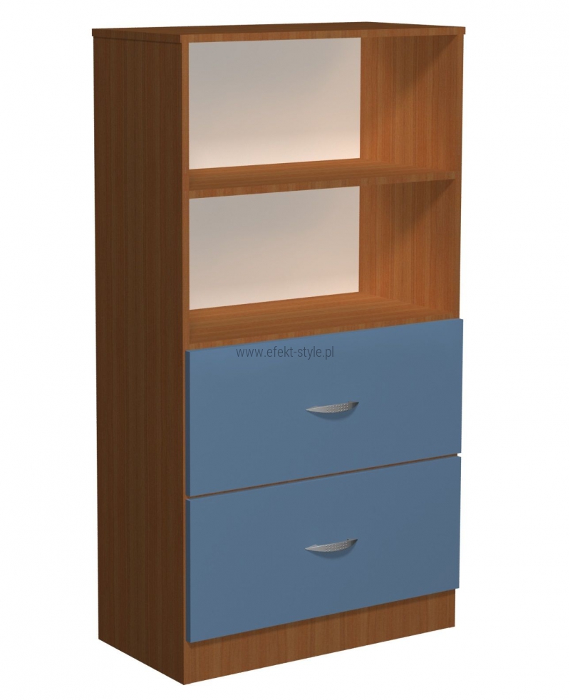 Regał z szufladami wykonany z płyty laminowanej 18 mm. Posiada 2 otwarte półki oraz 2 pojemne szuflady.
