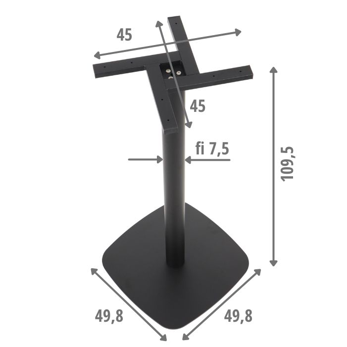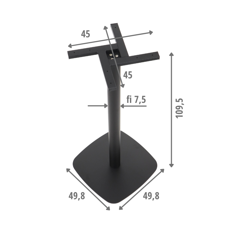 Element górny (krzyżak): Kwadratowy element montażowy o wymiarach 45 x 45 cm, umożliwiający pewne i stabilne przymocowanie blatu. Wyposażony w 8 otworów montażowych o średnicy 5 mm, co zapewnia uniwersalność i łatwość montażu większości blatów. -