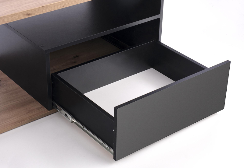 - Przestronność: przestrzeń do przechowywania z zamkniętą szufladą oraz otwartą półką, doskonała na książki, czasopisma i inne drobiazgi