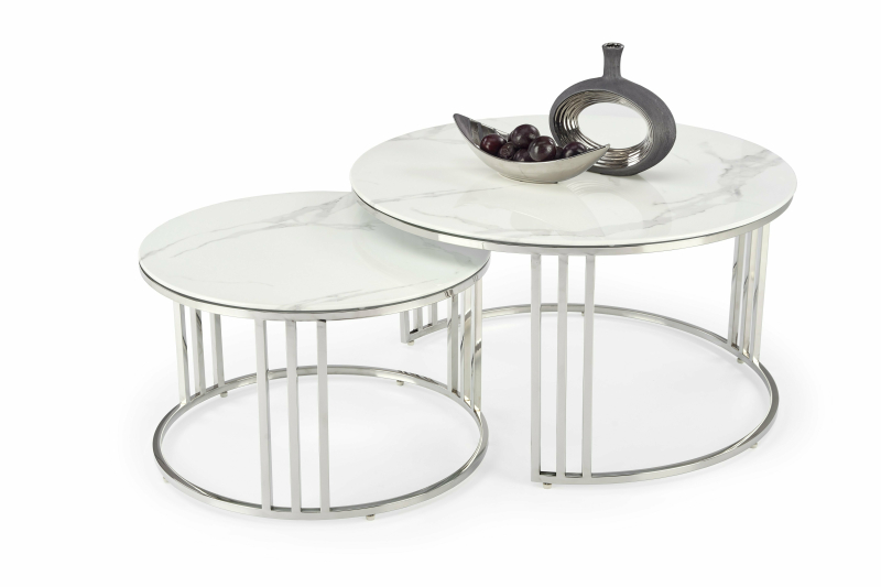 Ławy MERCURY 2 to połączenie wysokiej jakości szkła w eleganckim białym marmurze oraz stali nierdzewnej, której srebrny stelaż dodaje lekkości i nowoczesnego wyrazu. Dzięki zastosowaniu tych materiałów, meble są nie tylko estetyczne, ale również trwałe i łatwe w pielęgnacji. Biała marmurowa powierzchnia jest doskonała do wyeksponowania dekoracji, a stalowy stelaż zapewnia stabilność i wsparcie.