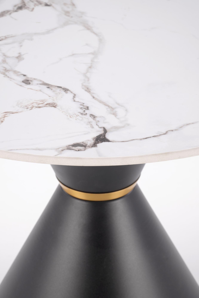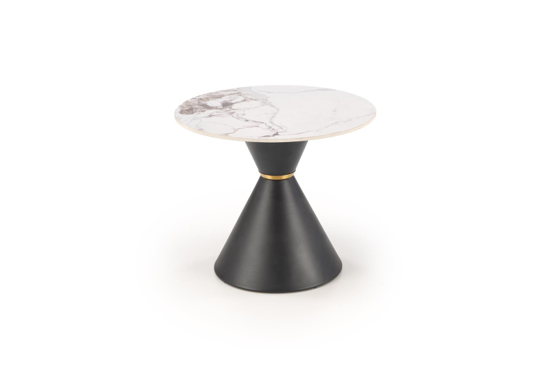 | Ława GORETTI_S to wyjątkowy element, który łączy w sobie elegancję i nowoczesność. Jej okrągły blat o średnicy 60 cm wykonany jest z trwałego spieku stylizowanego na biały marmur, co nadaje jej luksusowego charakteru. Kontrastująca podstawa w kolorze czarnym, wykonana ze stali malowanej proszkowo, wyróżnia się nowoczesnym kształtem stożka. Delikatny akcent w postaci złotego pierścienia dodaje całości szyku i wyrafinowania. Wymiary ławy wynoszą 60 cm średnicy i 51 cm wysokości, co sprawia, że idealnie wpasuje się w różnorodne wnętrza, od nowoczesnych po bardziej klasyczne. GORETTI_S może pełnić funkcję stolika kawowego w salonie, a także stylowego dodatku do przestrzeni biurowej, doskonale komponując się z innymi meblami i dekoracjami. Dzięki swojemu minimalistycznemu, ale wyrafinowanemu wyglądowi, przyciąga wzrok i staje się centralnym punktem każdego pomieszczenia. Ława została zaprojektowana z myślą o funkcjonalności i trwałości. Spiek, wykorzystany do produkcji blatu, jest odporny na zarysowania oraz łatwy w utrzymaniu czystości, co czyni go doskonałym wyborem dla intensywnie użytkowanych przestrzeni. Solidna stal malowana proszkowo zapewnia stabilność i długowieczność, a jej eleganckie wykończenie sprawia, że ława GORETTI_S prezentuje się niezwykle estetycznie. - Materiał blatu: spiek imitujący biały marmur