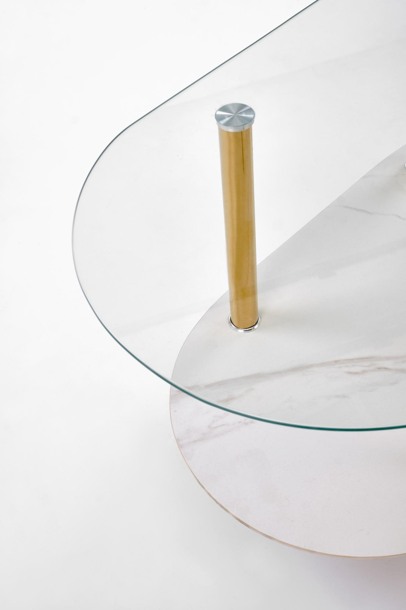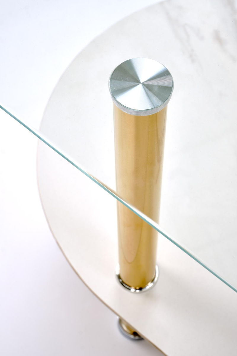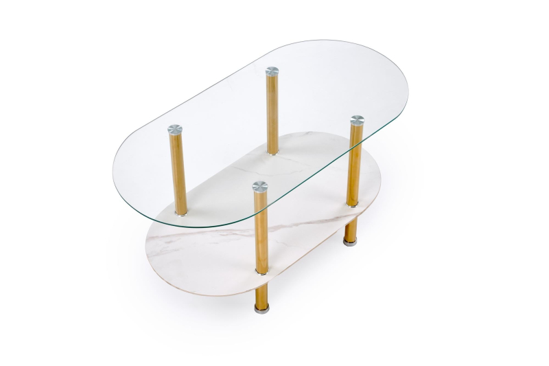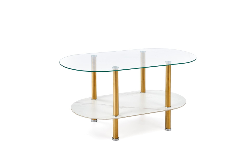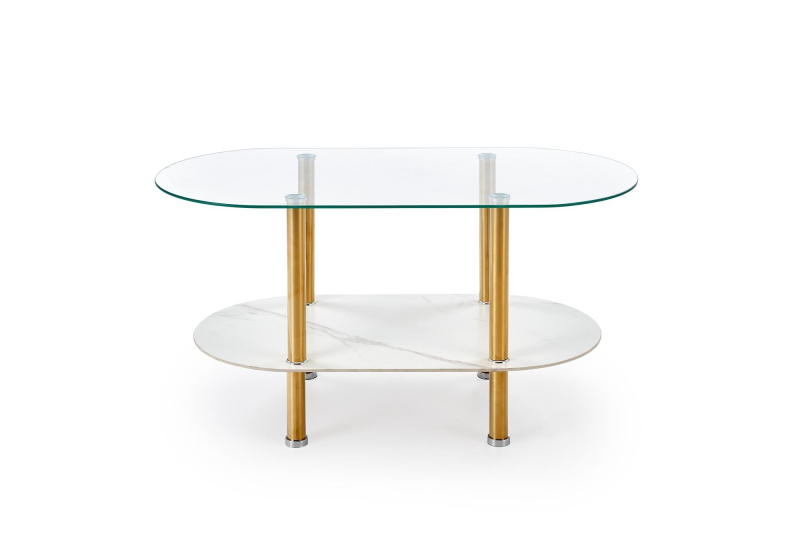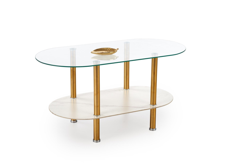 | Ława DUCAT to elegancki element, który doskonale wpisuje się w nowoczesne aranżacje. Jej blat wykonany z przezroczystego szkła w połączeniu z dolnym półką w odcieniu białego marmuru oraz stelażem ze stali chromowanej w kolorze złotym sprawiają, że ten mebel prezentuje się niezwykle stylowo i luksusowo. Oto najważniejsze cechy ławy DUCAT: - Wymiary: 100 cm długości, 50 cm szerokości, 51 cm wysokości