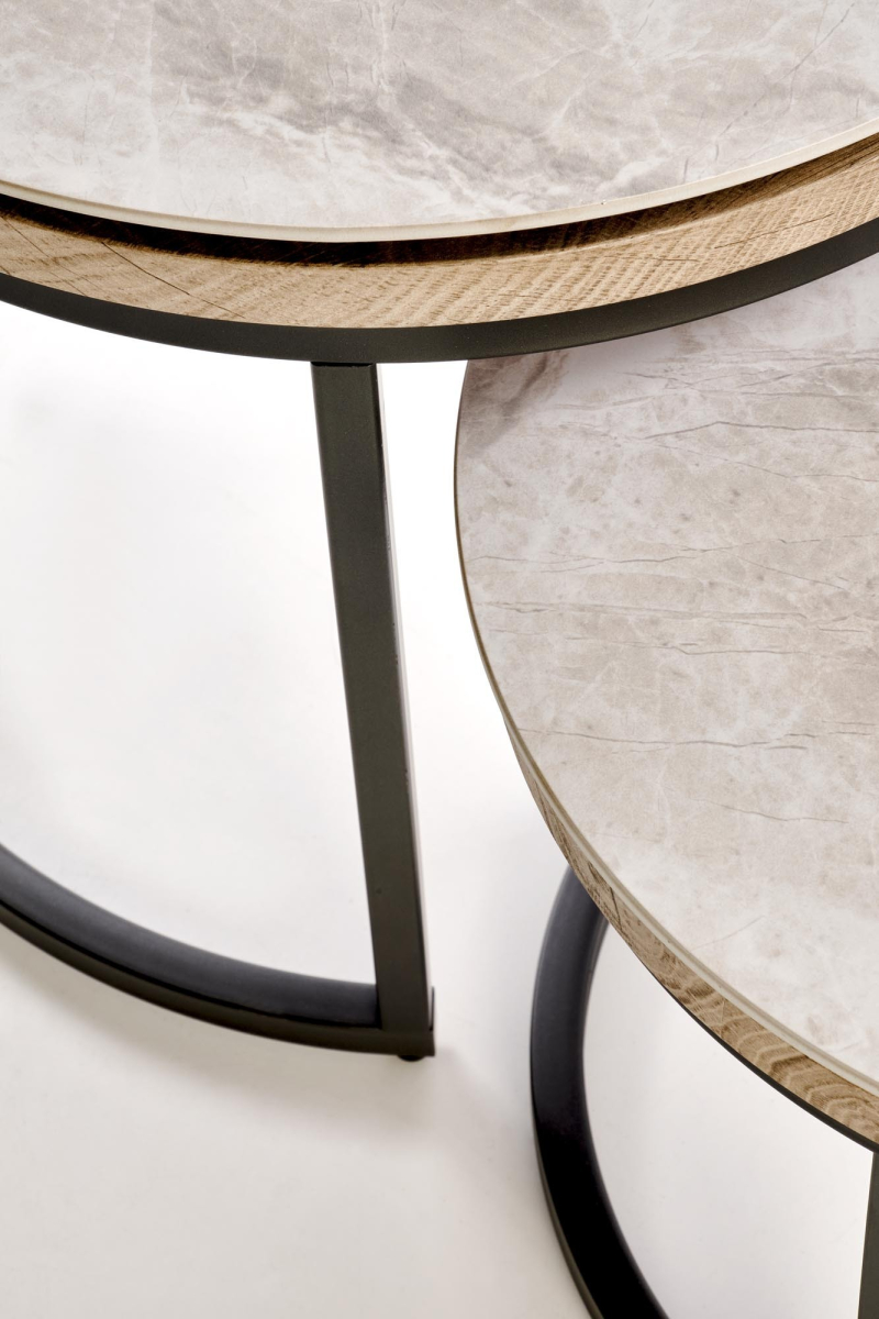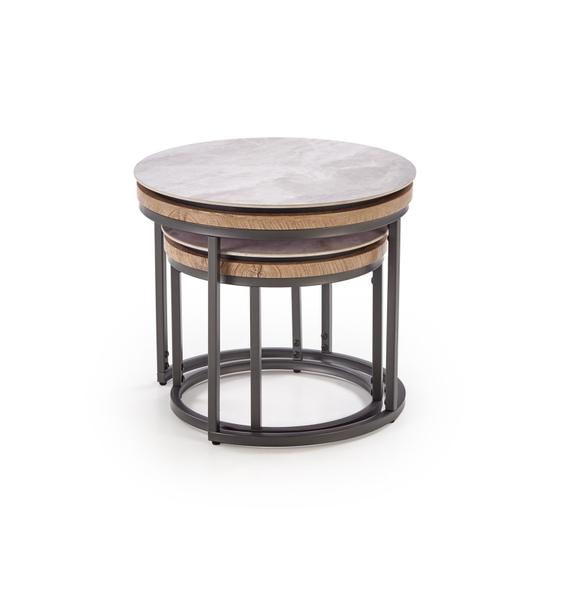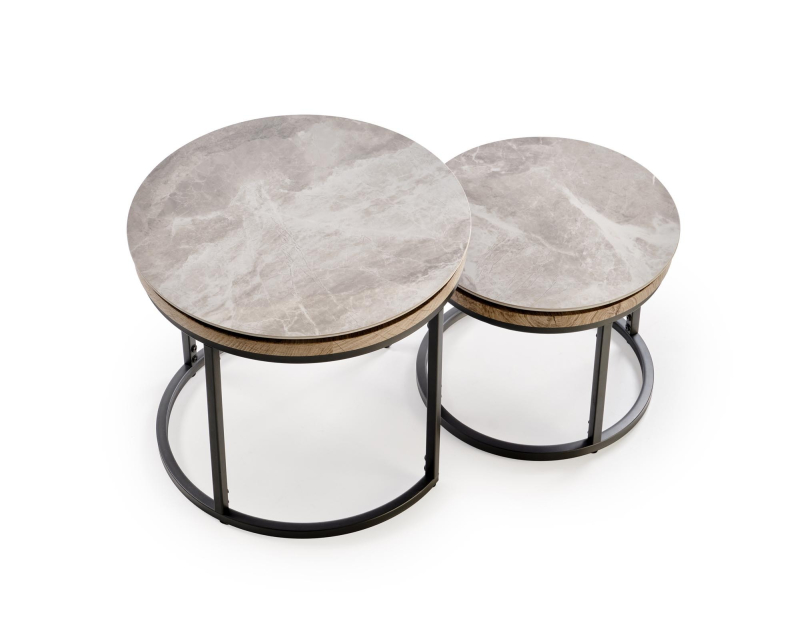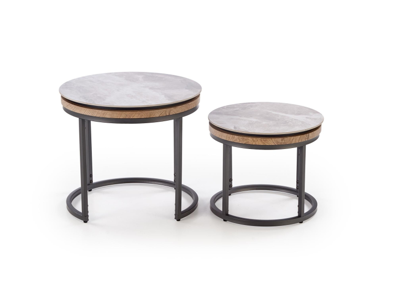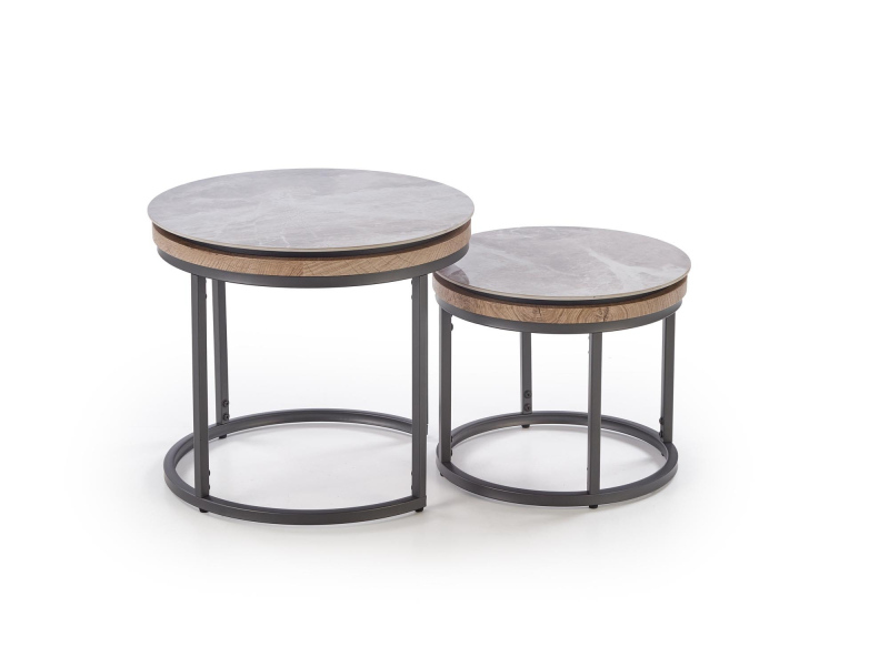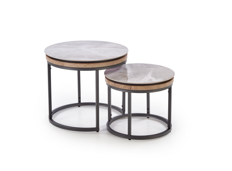 - Wymiary: Zestaw składa się z dwóch ław o średnicach: 54 cm i 44 cm oraz wysokościach: 48 cm i 38 cm.