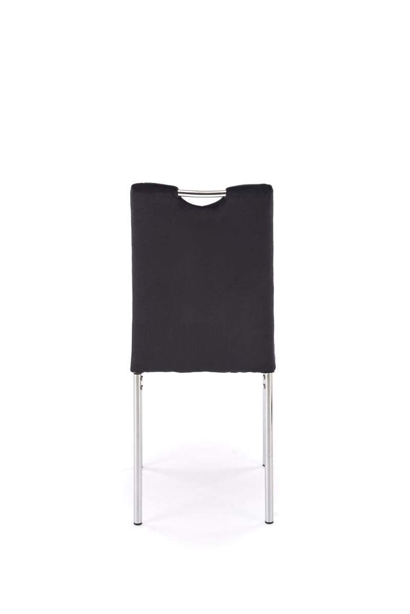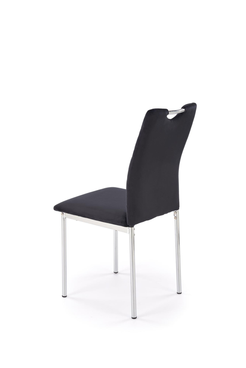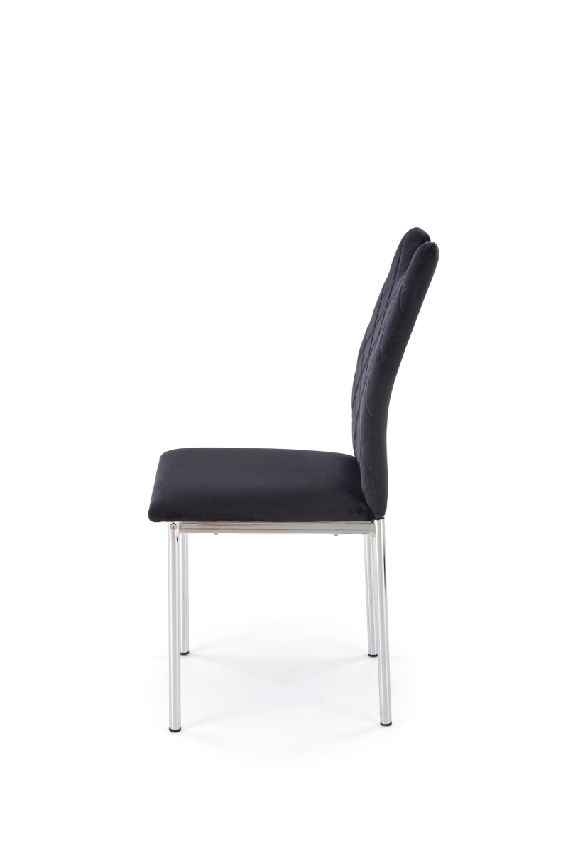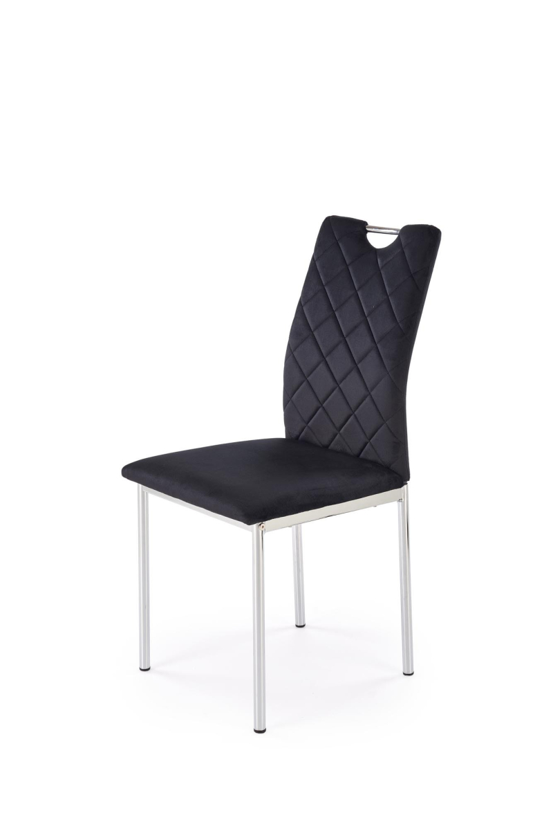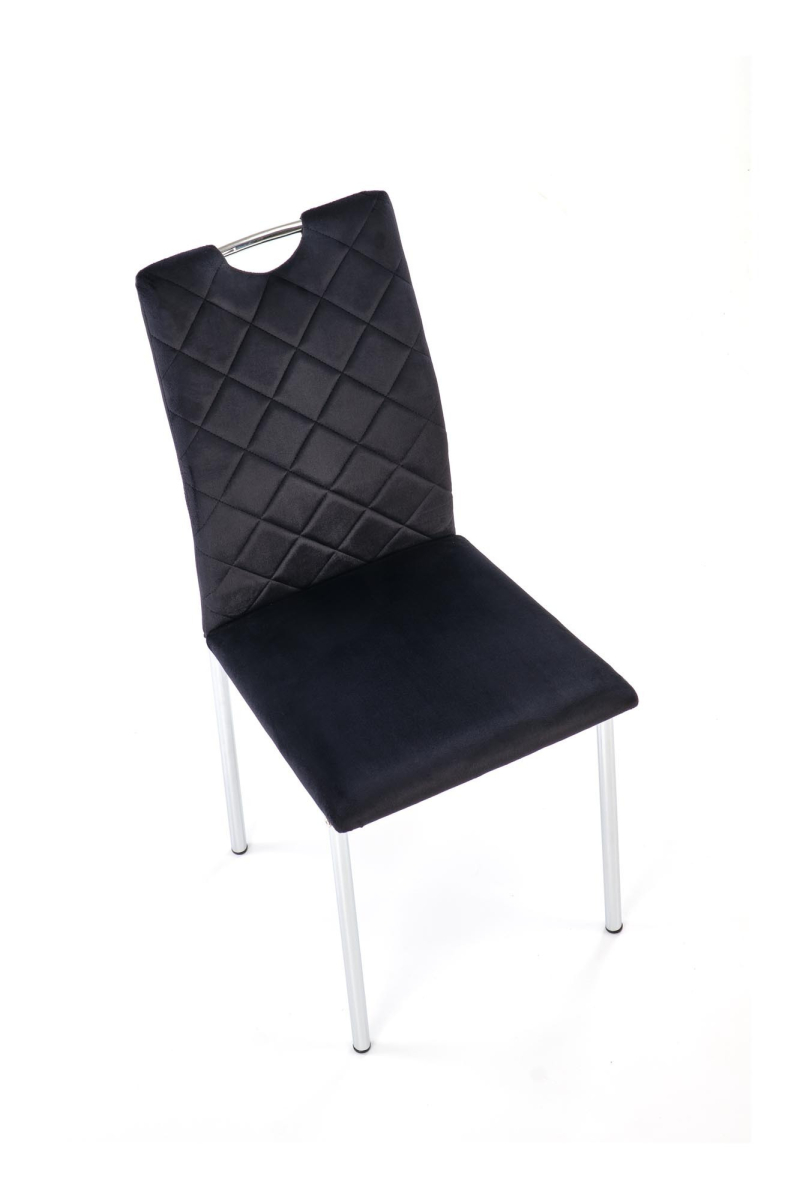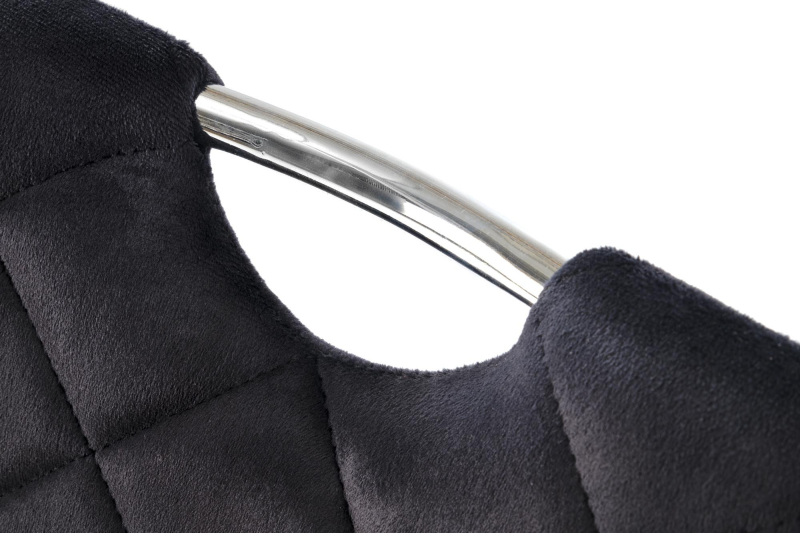 Krzesło K578 to stylowy mebel, który łączy komfort użytkowania z nowoczesnym designem. Miękka, velvetowa tapicerka i charakterystyczne przeszycia w romby dodają mu elegancji, a srebrny, metalowy stelaż zapewnia stabilność i trwałość. Praktyczny uchwyt w oparciu zwiększa funkcjonalność krzesła, ułatwiając jego przesuwanie.