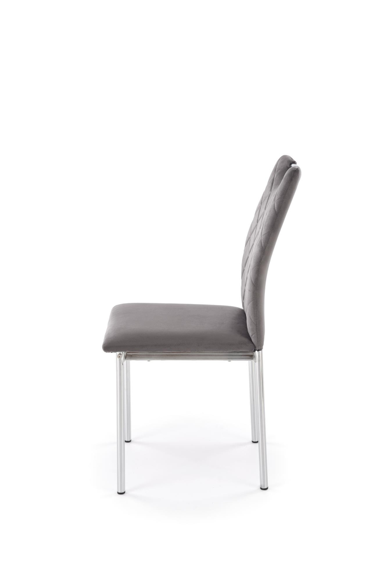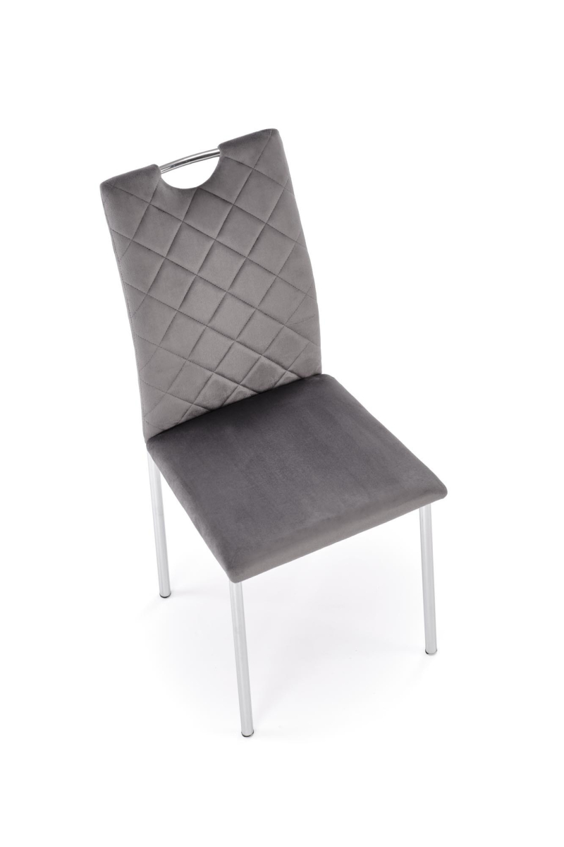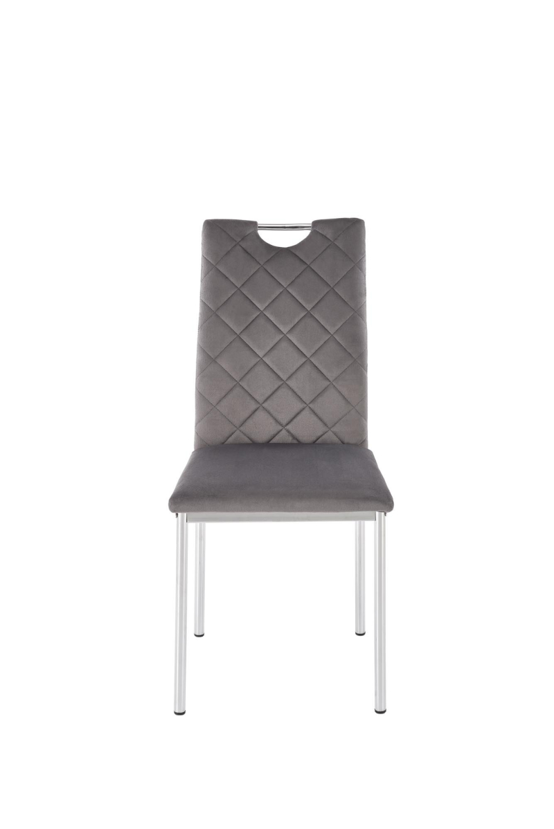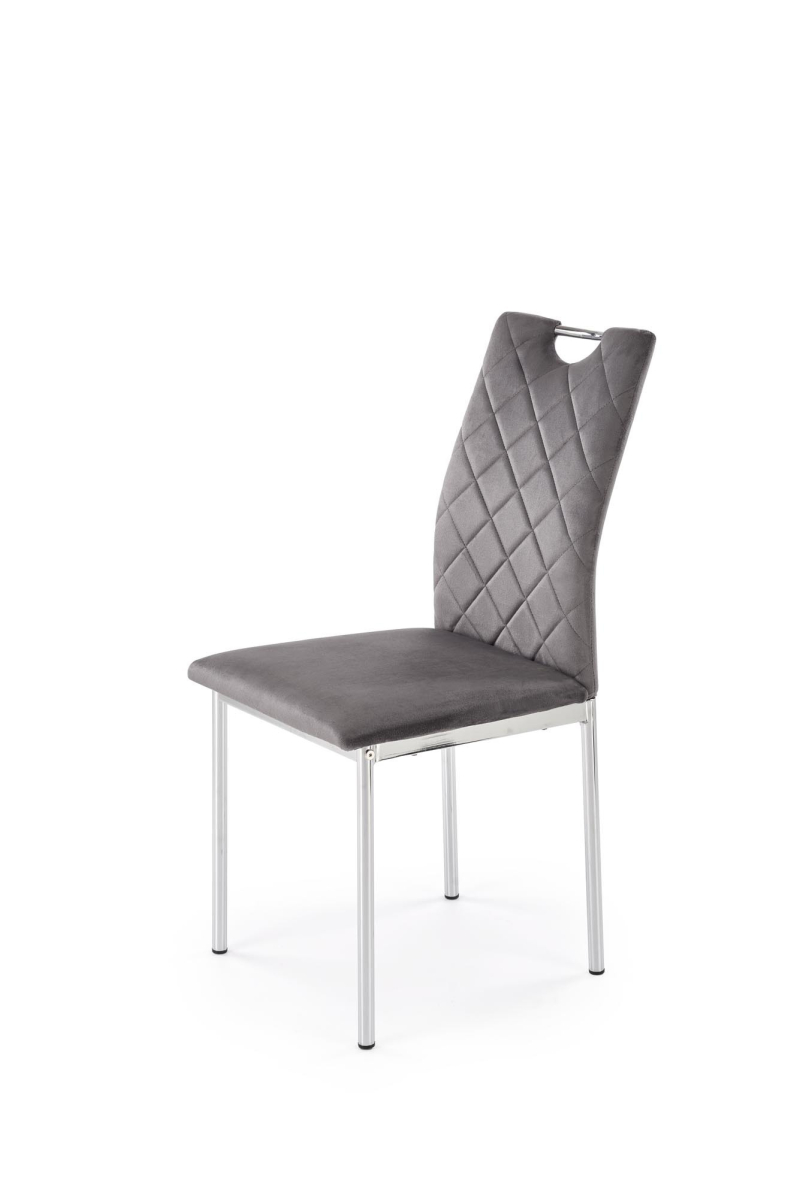 Krzesło K578 to stylowy mebel, który łączy komfort użytkowania z nowoczesnym designem. Miękka, velvetowa tapicerka i charakterystyczne przeszycia w romby dodają mu elegancji, a srebrny, metalowy stelaż zapewnia stabilność i trwałość. Praktyczny uchwyt w oparciu zwiększa funkcjonalność krzesła, ułatwiając jego przesuwanie.