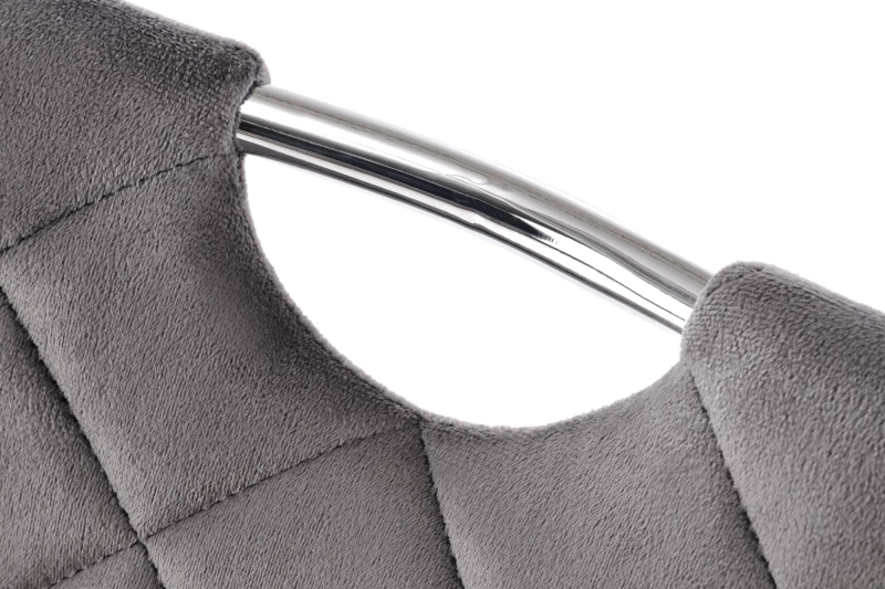Krzesło K578 to stylowy mebel, który łączy komfort użytkowania z nowoczesnym designem. Miękka, velvetowa tapicerka i charakterystyczne przeszycia w romby dodają mu elegancji, a srebrny, metalowy stelaż zapewnia stabilność i trwałość. Praktyczny uchwyt w oparciu zwiększa funkcjonalność krzesła, ułatwiając jego przesuwanie