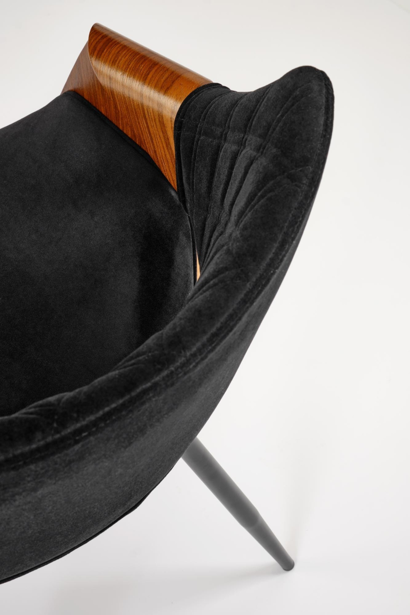 Siedzisko i Oparcie z Tkaniny Velvet: Miękka i przyjemna w dotyku tkanina Bluvel w kolorze czarnym zapewnia komfort siedzenia, dodając krzesłu nuty elegancji. -