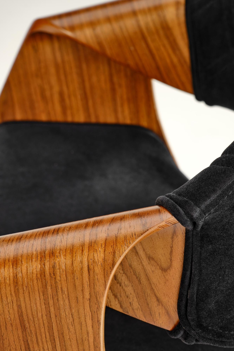 Konstrukcja ze Sklejki Giętej: Elementy konstrukcyjne krzesła, tworzące podłokietniki i oparcie, wykonane są ze sklejki giętej w ciepłym odcieniu orzechowym. Nadaje to krzesłu charakterystyczny wygląd i naturalny akcent. -