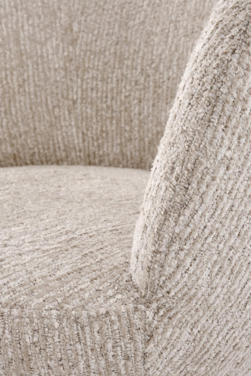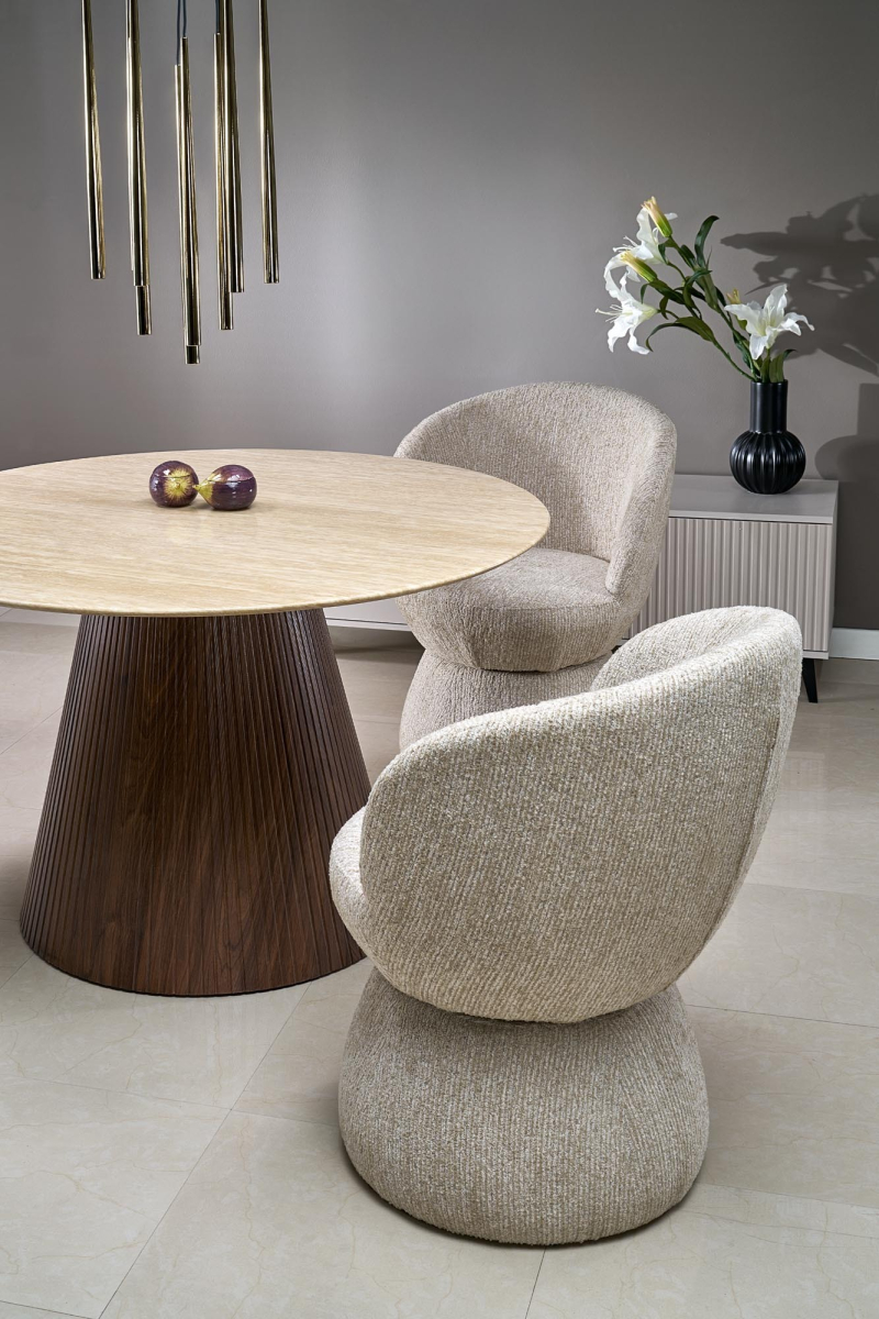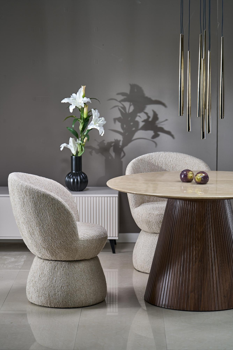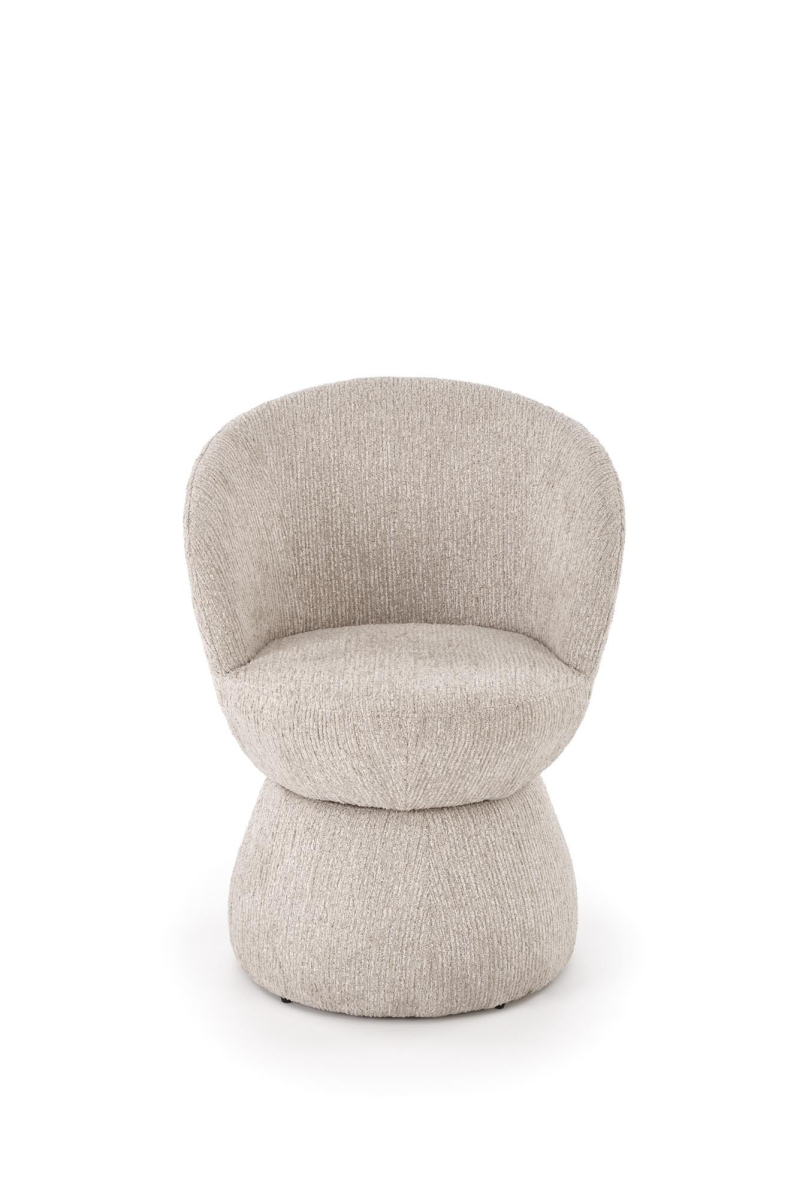 • Solidna podstawa: Krzesło charakteryzuje się stabilną, zaokrągloną podstawą, również tapicerowaną, tworząc spójny i elegancki wygląd.